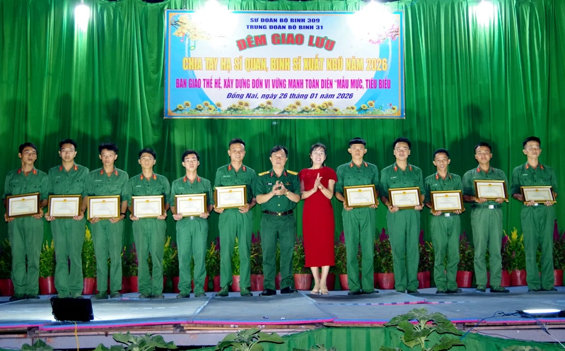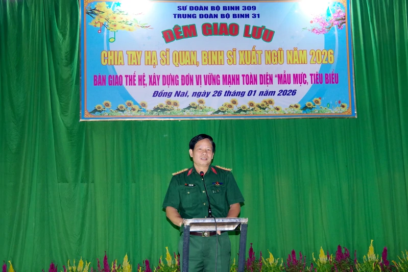 (QK Online) - Tối 26/1, Trung đoàn 31, Sư đoàn 309 tổ chức đêm giao lưu chia tay hạ sĩ quan, binh sĩ xuất ngũ năm 2026 với chủ đề “Bàn giao thế hệ, xây dựng đơn vị vững mạnh toàn diện, mẫu mực, tiêu biểu”. Đại tá Vũ Văn Tám, Bí thư Đảng ủy, Chính ủy Sư đoàn dự đêm giao lưu.