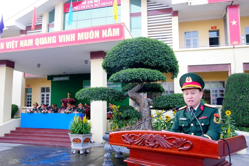 Đại tá Huỳnh Việt Tâm, Sư đoàn trưởng Sư đoàn 309 phát biểu chúc mừng các đồng chí hạ sĩ quan, binh sĩ hoàn thành nghĩa vụ quân sự năm 2026.