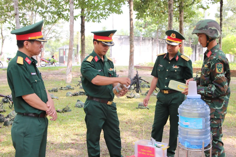 Trung tá Hà Đình Thái, Phó Trung đoàn trưởng Trung đoàn 4, Sư đoàn 5 (thứ 2 từ trái sang) kiểm tra vật chất phòng chống say nắng, say nóng tại thao trường.