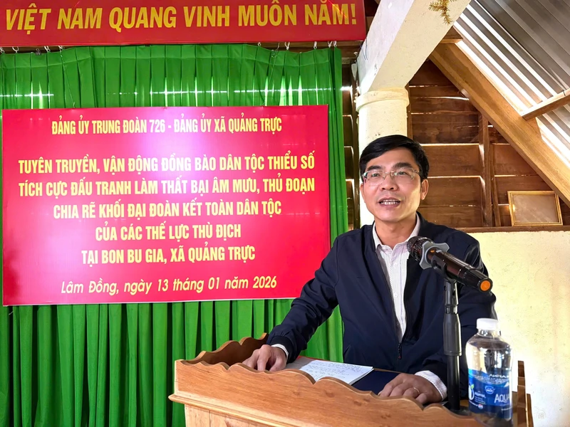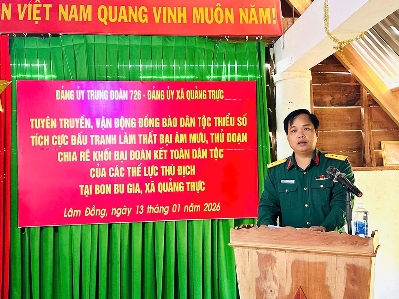 (QK7 Online) - Ngày 13/1, Đảng ủy Trung đoàn 726 (Binh đoàn 16) phối hợp với Đảng ủy xã Quảng Trực, Công an xã Quảng Trực cùng Đồn Biên phòng Đắk Dang (Bộ CHQS tỉnh Lâm Đồng) tổ chức tuyên truyền, vận động đồng bào dân tộc thiểu số tích cực đấu tranh làm thất bại âm mưu, thủ đoạn chia rẽ khối đại đoàn kết toàn dân tộc của các thế lực thù địch tại bon Bu Gia và bon Đắk Huýt (xã Quảng Trực, tỉnh Lâm Đồng).