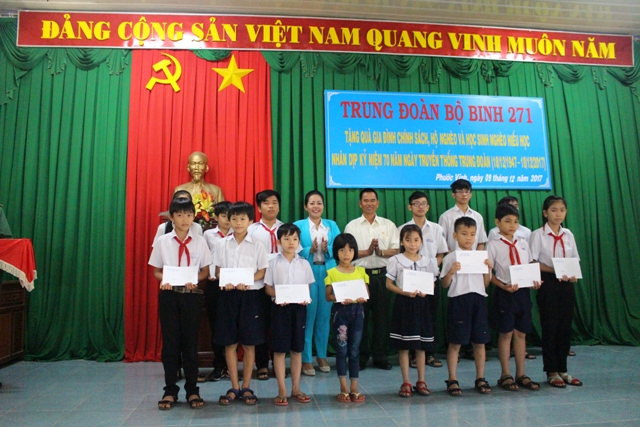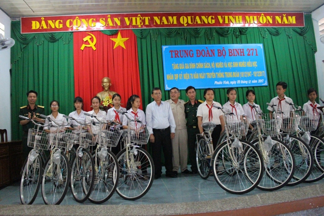 Trung đoàn đã trao tặng 10 suất quà cho gia đình chính sách, hộ nghèo mỗi suất 500 ngàn đồng tiền mặt và 25 kg gạo; tặng 50 suất học bổng mỗi suất trị giá 500 ngàn đồng tiền mặt và 10 chiếc xe đạp (mỗi chiếc 3 triệu đồng) cho học sinh nghèo hiếu học tại thị trấn Phước Vĩnh, huyện Phú Giáo, tỉnh Bình Dương. Đây là tấm lòng của các cựu chiến binh và cán bộ, chiến sĩ Trung đoàn bộ binh 271 giành tặng cho các gia đình chính sách, học sinh nghèo hiếu học tại địa bàn Trung đoàn đang đóng quân.