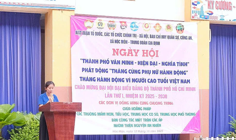 (QK7 Online) - Trong không khí thi đua sôi nổi chào mừng Đại hội đại biểu Đảng bộ Thành phố Hồ Chí Minh, sáng 11/10, Trung đoàn Gia Định, Bộ Tư lệnh TPHCM phối hợp Mặt trận Tổ quốc Việt Nam, Ban chỉ huy quân sự, Công an xã Hóc Môn và các tổ chức chính trị - xã hội tổ chức Ngày hội “Thành phố văn minh - hiện đại - nghĩa tình”, phát động “Tháng cùng phụ nữ hành động” và “Tháng hành động vì người cao tuổi Việt Nam”.