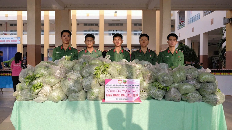 Bên cạnh đó, tại “Phiên chợ nghĩa tình”, các loại rau, củ, quả do cán bộ, chiến sĩ Trung đoàn tăng gia sản xuất được san sẻ đến những hộ gia đình khó khăn thể hiện tấm lòng sẻ chia, tô thắm tình quân - dân gắn kết.