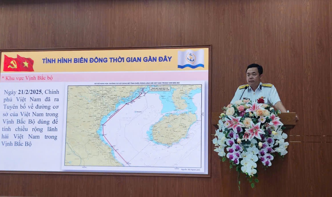 Trung tá Phạm Ngọc Hưng, Phó Chính ủy Trung tâm Huấn luyện Vùng 2 Hải quân thông tin về tình hình biển đảo tại hội nghị.