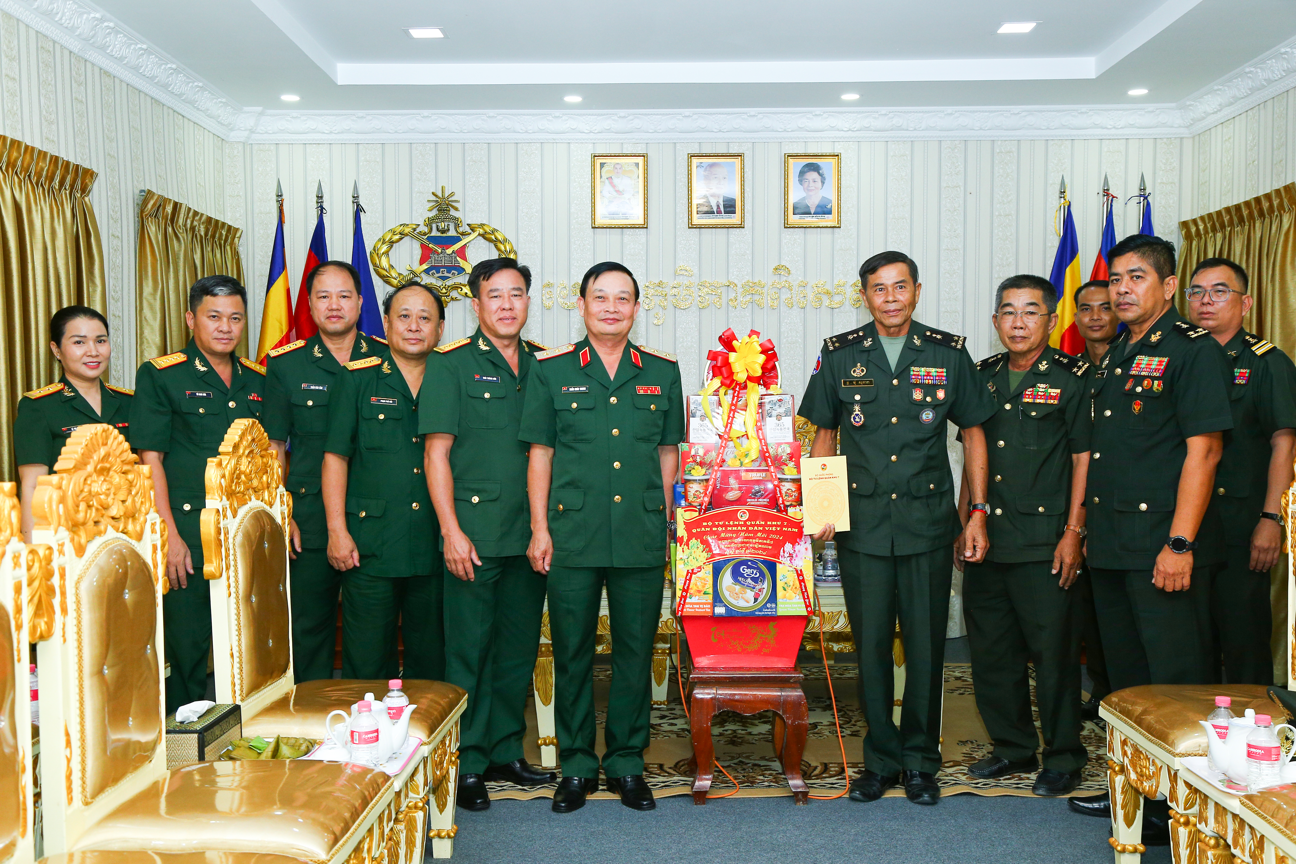 (QK7 Online) - Tiếp tục chương trình chúc Tết cổ truyền Chol Chnam Thmay của dân tộc Khmer, ngày 3/4, đoàn công tác Quân khu 7 do Trung tướng Trần Hoài Trung, Bí thư Đảng ủy, Chính ủy Quân khu làm trưởng đoàn đến chúc Tết Đại tướng Tea Seiha, Phó Thủ tướng, Bộ trưởng Bộ Quốc phòng Campuchia; Tổng cục Dịch vụ Quân sự/Bộ Quốc phòng Campuchia; Bộ Tư lệnh Lục quân, Bộ Tư lệnh Hải quân, Bộ Tư lệnh Quân khu Đặc biệt, Bộ Tư lệnh Cảnh vệ, Bộ Tư lệnh Hiến binh, Lữ đoàn 70 thuộc Quân đội Hoàng gia Campuchia.