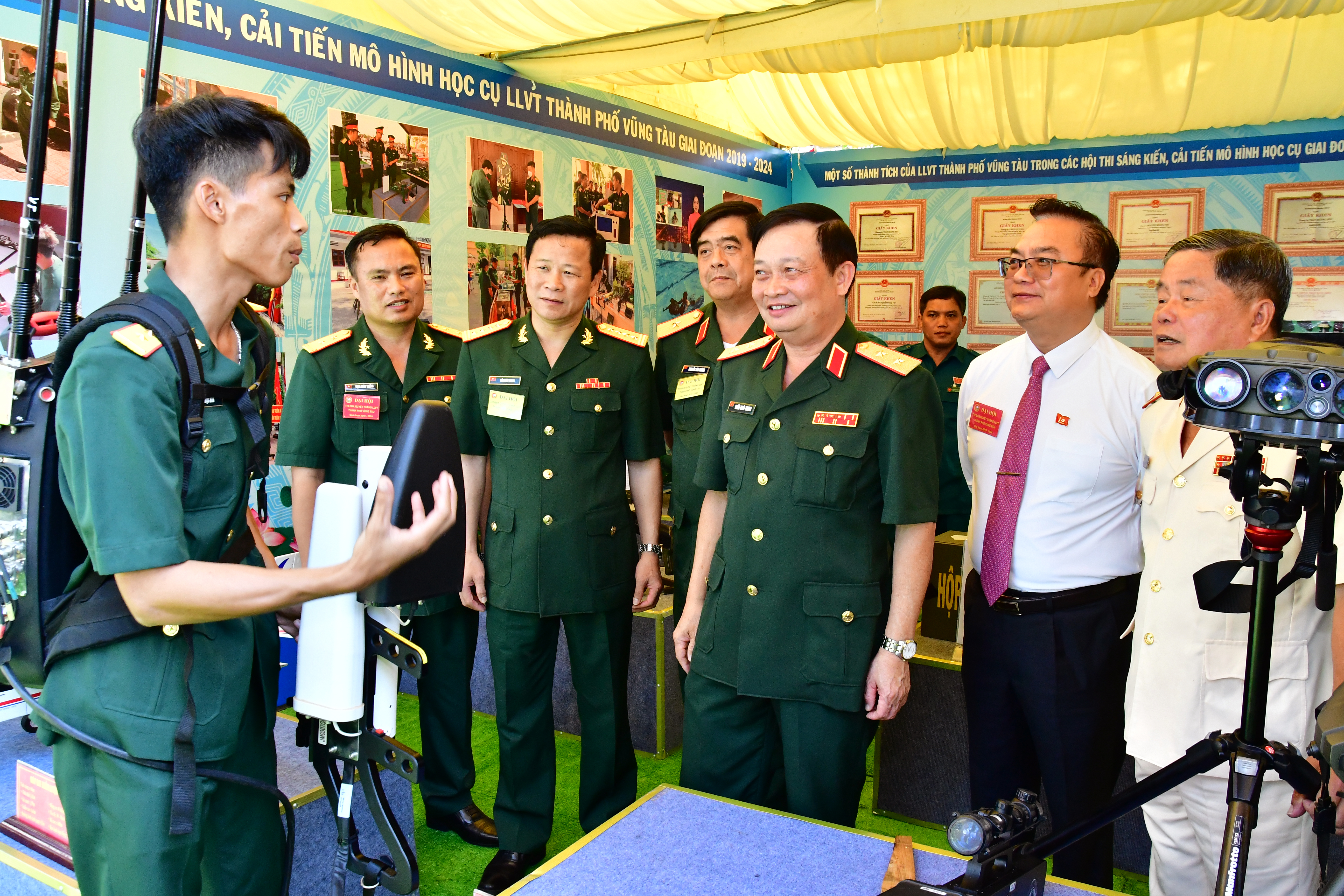 Trung tướng Trần Hoài Trung, Bí thư Đảng ủy, Chính ủy Quân khu 7 và các đại biểu tham quan trưng bày các sáng kiến cải tiến mô hình học cụ của LLVT thành phố Vũng Tàu.