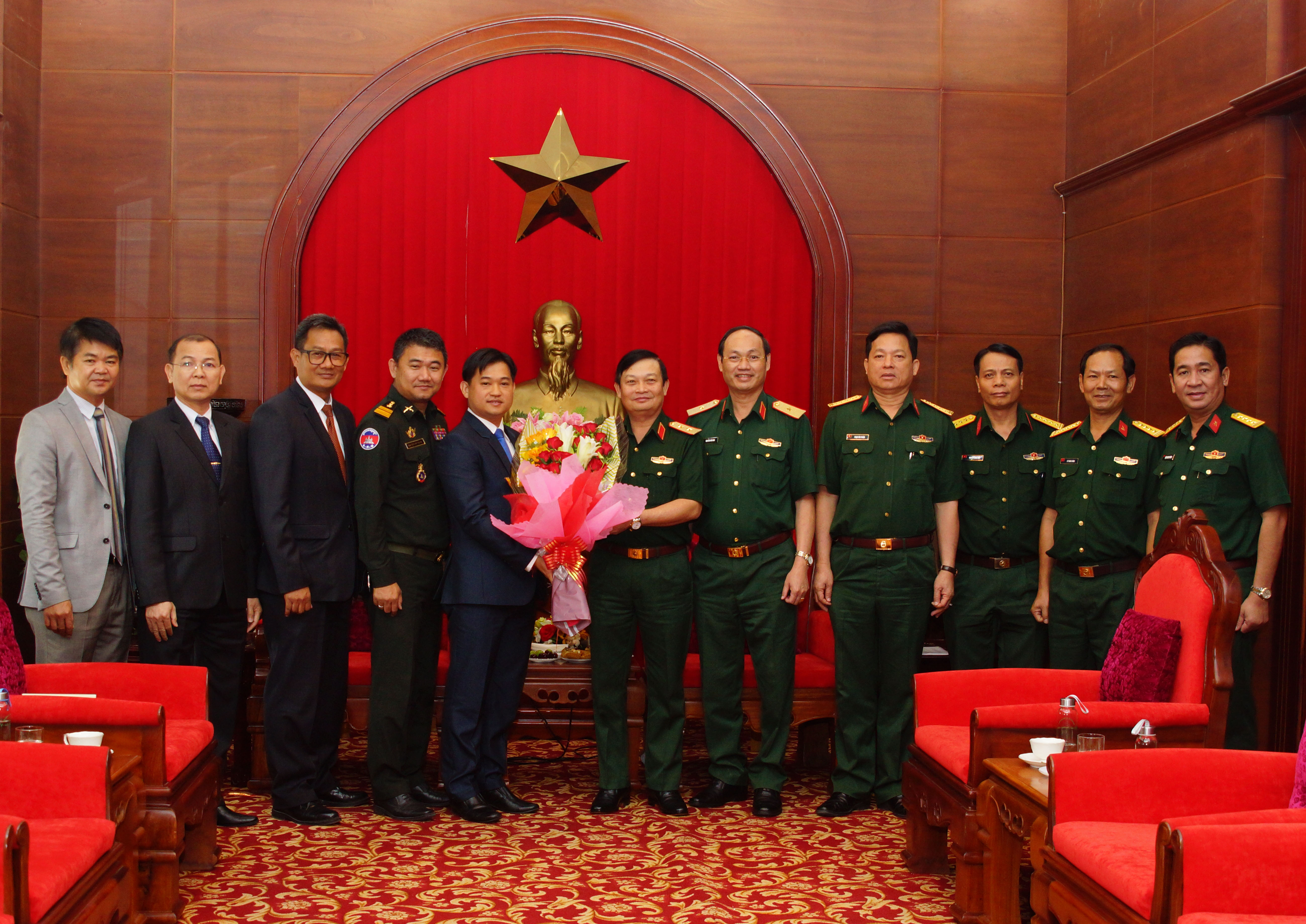 Trung tướng Trần Hoài Trung Bí thư Đảng ủy, Chính ủy Quân khu 7 và các thành viên tặng hoa chúc mừng Ngài Sóc Đa – rết nhận nhiệm vụ Tổng lãnh sự Vương quốc Campuchia tại Thành phố Hồ Chí Minh