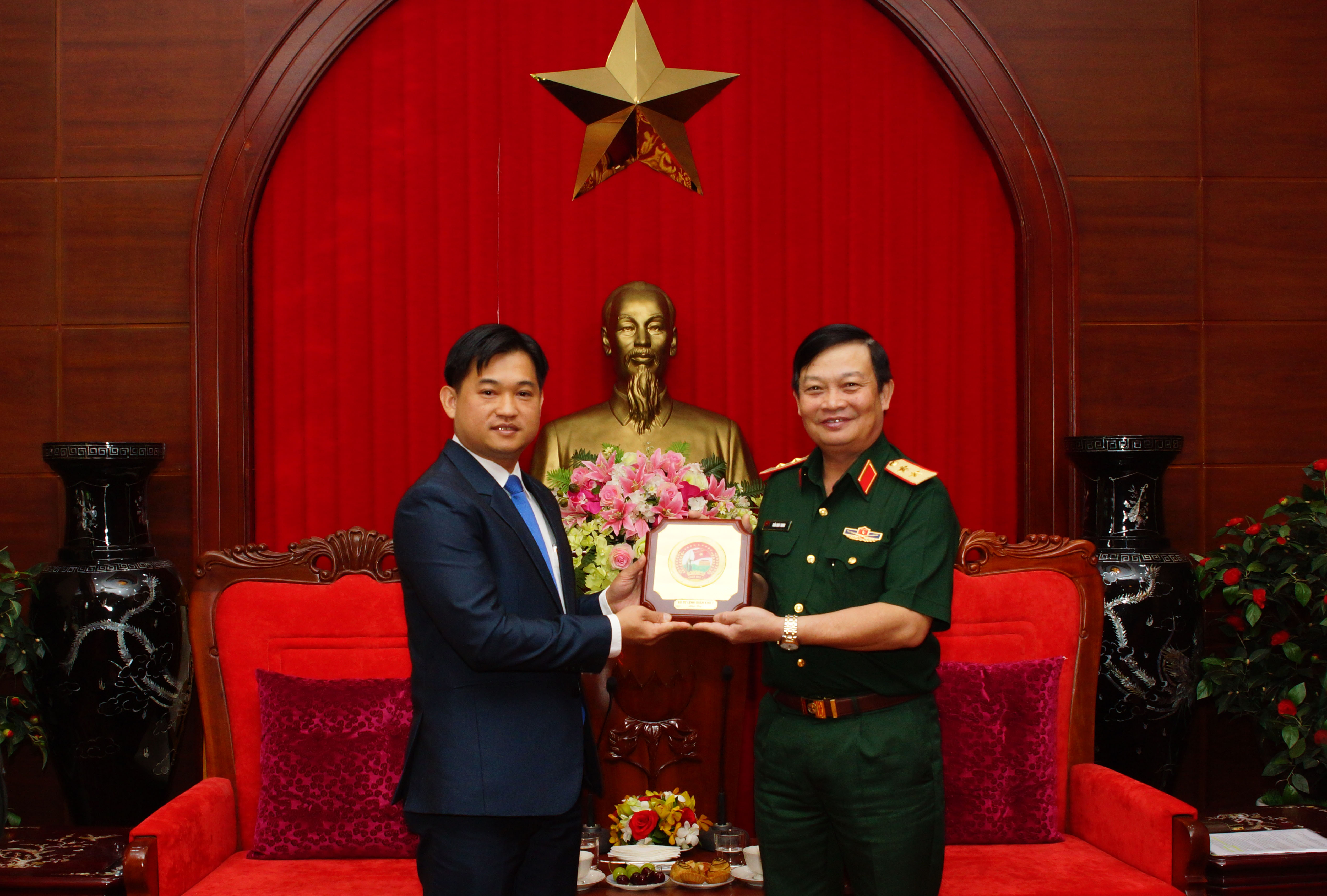 Trung tướng Trần Hoài Trung, Bí thư Đảng ủy, Chính ủy Quân khu 7 tặng biểu trưng Quân khu 7 cho Ngài Sóc Đa - rết