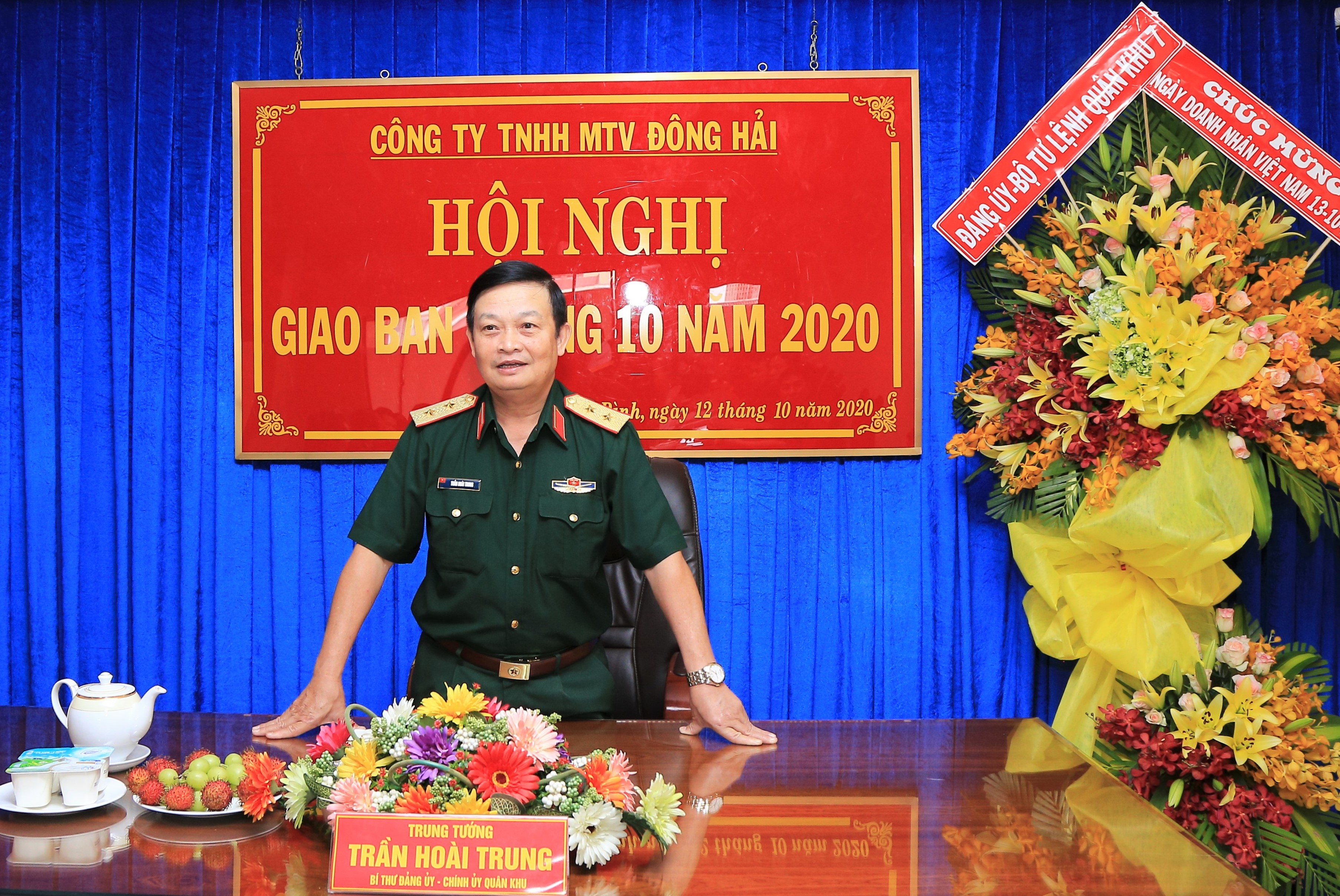 Trung tướng Trần Hoài Trung, Bí thư Đảng ủy, Chính ủy Quân khu tặng hoa chúc mừng Công ty Đông Hải