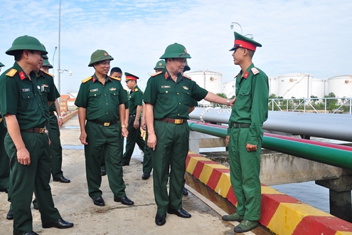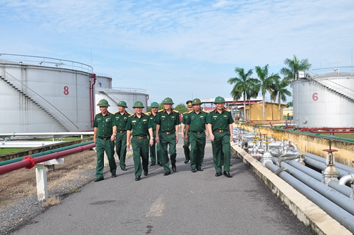 Trung tướng Trần Hoài Trung (bên phải) kiểm tra khu vực bể chứa xăng dầu của Kho VK102
