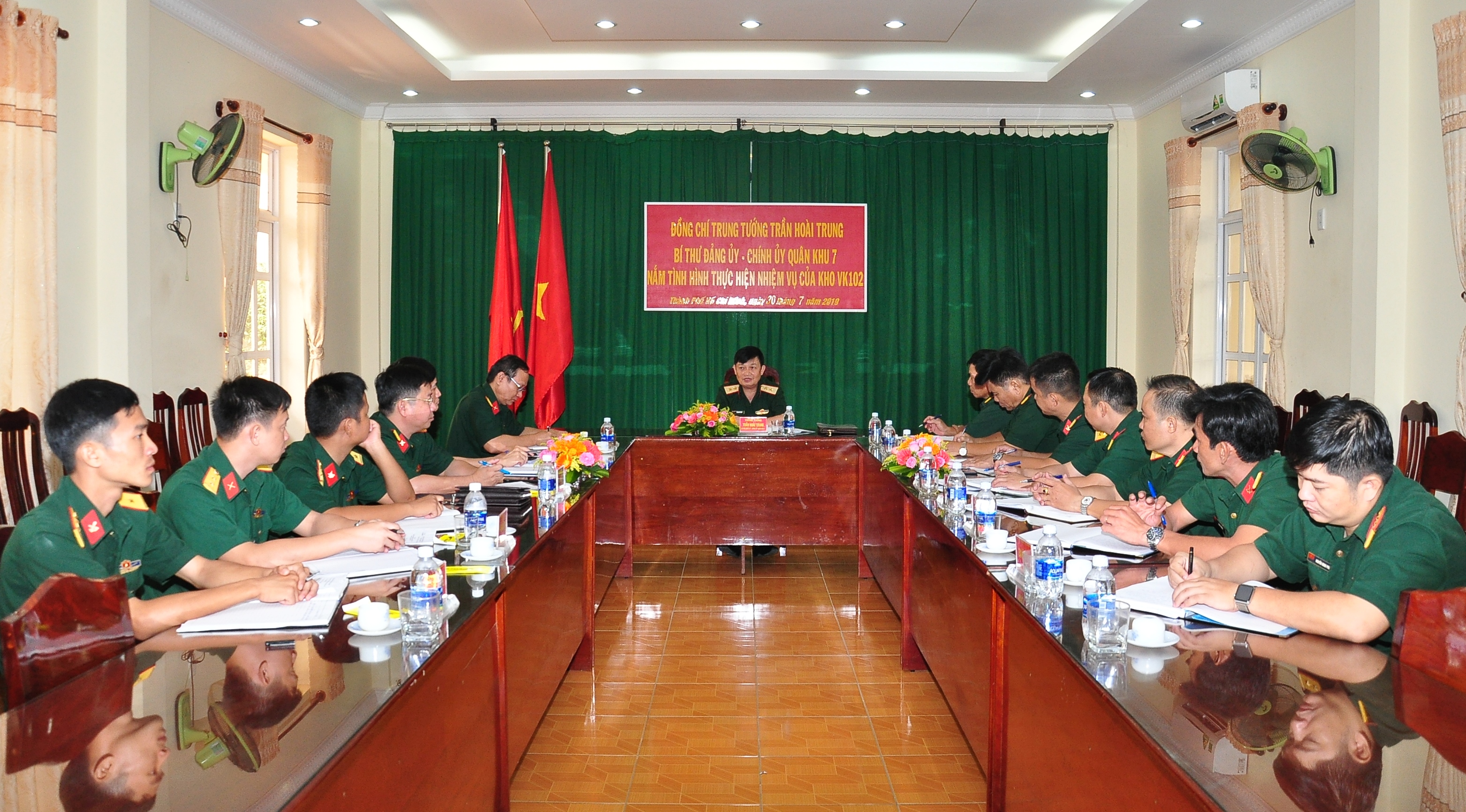 (QK7 Online) - Ngày 30/7, Trung tướng Trần Hoài Trung, Bí thư Đảng ủy, Chính ủy Quân khu 7 đến thăm, nắm tình hình thực hiện nhiệm vụ của Kho VK102 (Cục Hậu cần Quân khu). Tiếp và làm việc với đồng chí Chính ủy Quân khu có Đại tá Huỳnh Văn Mầm, Chính ủy Cục Hậu cần Quân khu và lãnh đạo, chỉ huy Kho VK102.