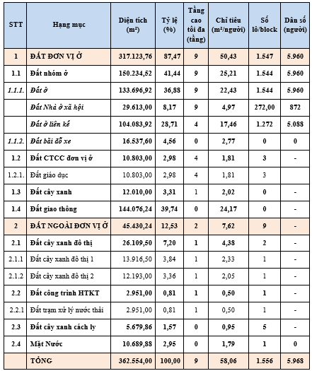 Hệ số sử dụng đất bình quân đạt khoảng 50,43 m²/người, phù hợp với tiêu chuẩn quy hoạch đô thị. Phần cây xanh, mặt nước và hạ tầng công cộng được xác định là các hạng mục chủ đầu tư phải xây dựng hoàn chỉnh và bàn giao cho Nhà nước quản lý, vận hành.