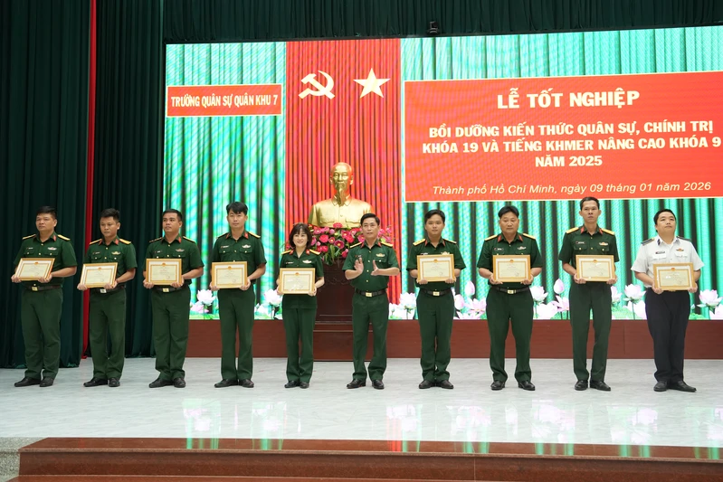 (QK7 Online) - Ngày 9/1, Trường Quân sự Quân khu 7 tổ chức Lễ tốt nghiệp Lớp Bồi dưỡng kiến thức quân sự, chính trị (BDKTQS, CT) khóa 19 và Bồi dưỡng tiếng Kh’mer nâng cao khóa 9 năm 2025. Dự và chỉ đạo Lễ tốt nghiệp có Đại tá Phạm Văn Kiên, Phó Hiệu trưởng Nhà trường.