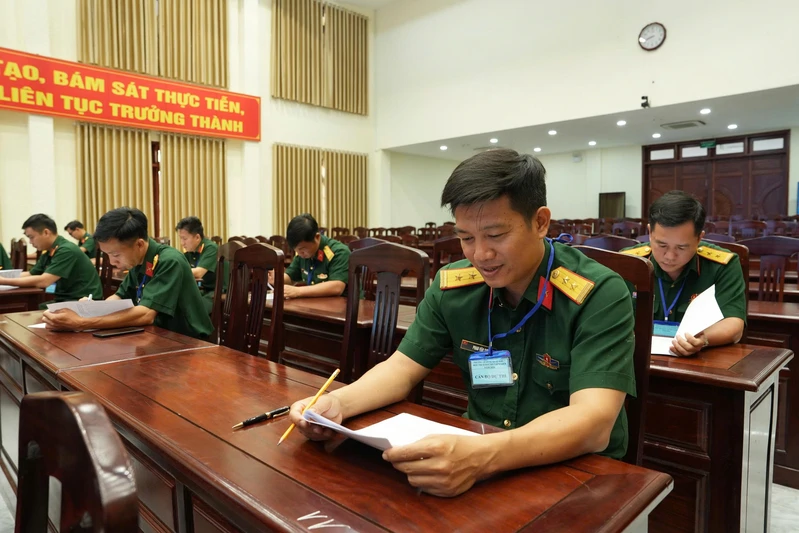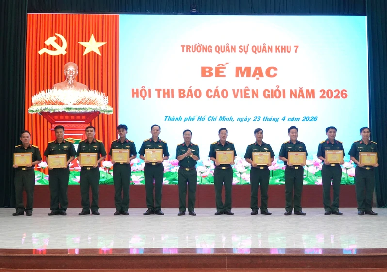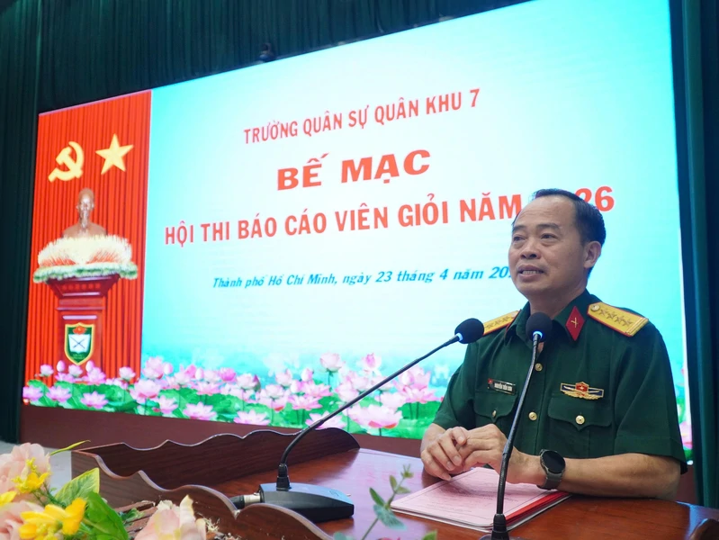 (QK7 Online) - Chiều ngày 23/4, Trường Quân sự Quân khu 7 tổ chức thi chung khảo, bế mạc và trao giải Hội thi Báo cáo viên giỏi cấp nhà trường năm 2026. Dự hội nghị có Đại tá Nguyễn Tiến Sơn, Phó Chính ủy nhà trường; các đồng chí đại diện cấp ủy, chỉ huy các cơ quan, khoa giáo viên, đơn vị; cán bộ, nhân viên nhà trường và 23 đồng chí tham gia hội thi.