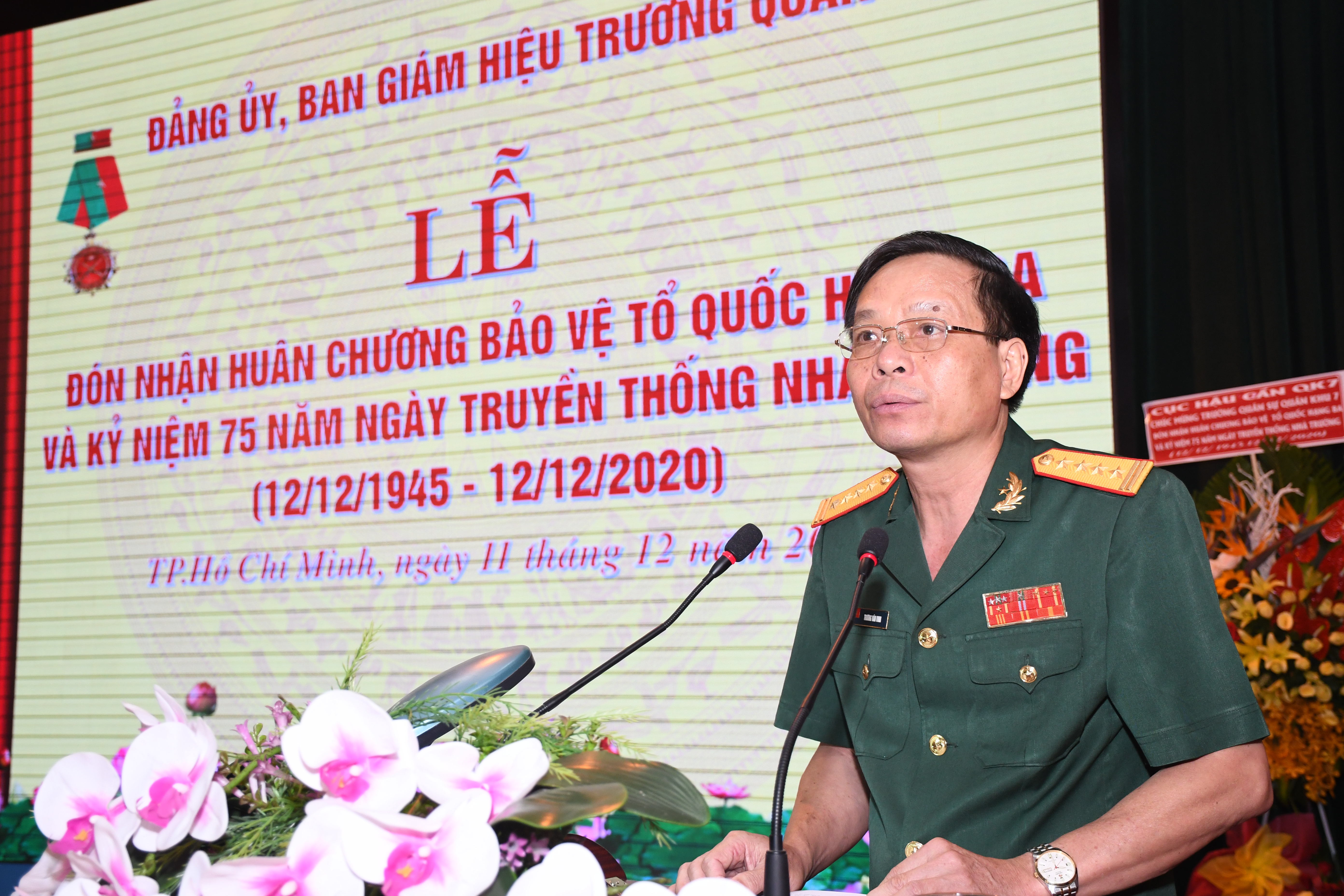 Thiếu tướng Đỗ Văn Bảnh, Phó Chính ủy Quân khu 7 biểu dương thành tích nhà trường đạt được trong 75 năm xây dựng, chiến đấu và trưởng thành.