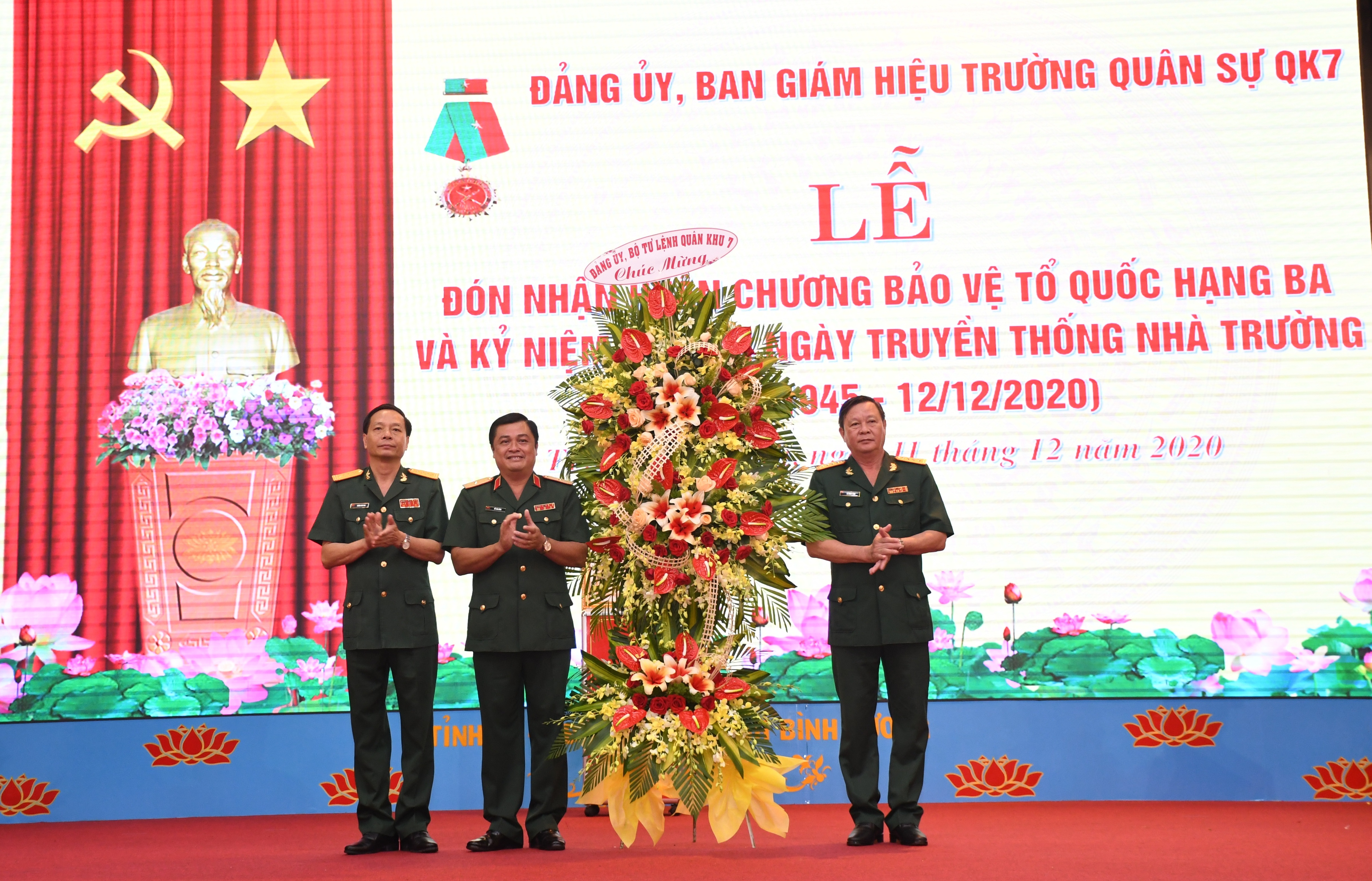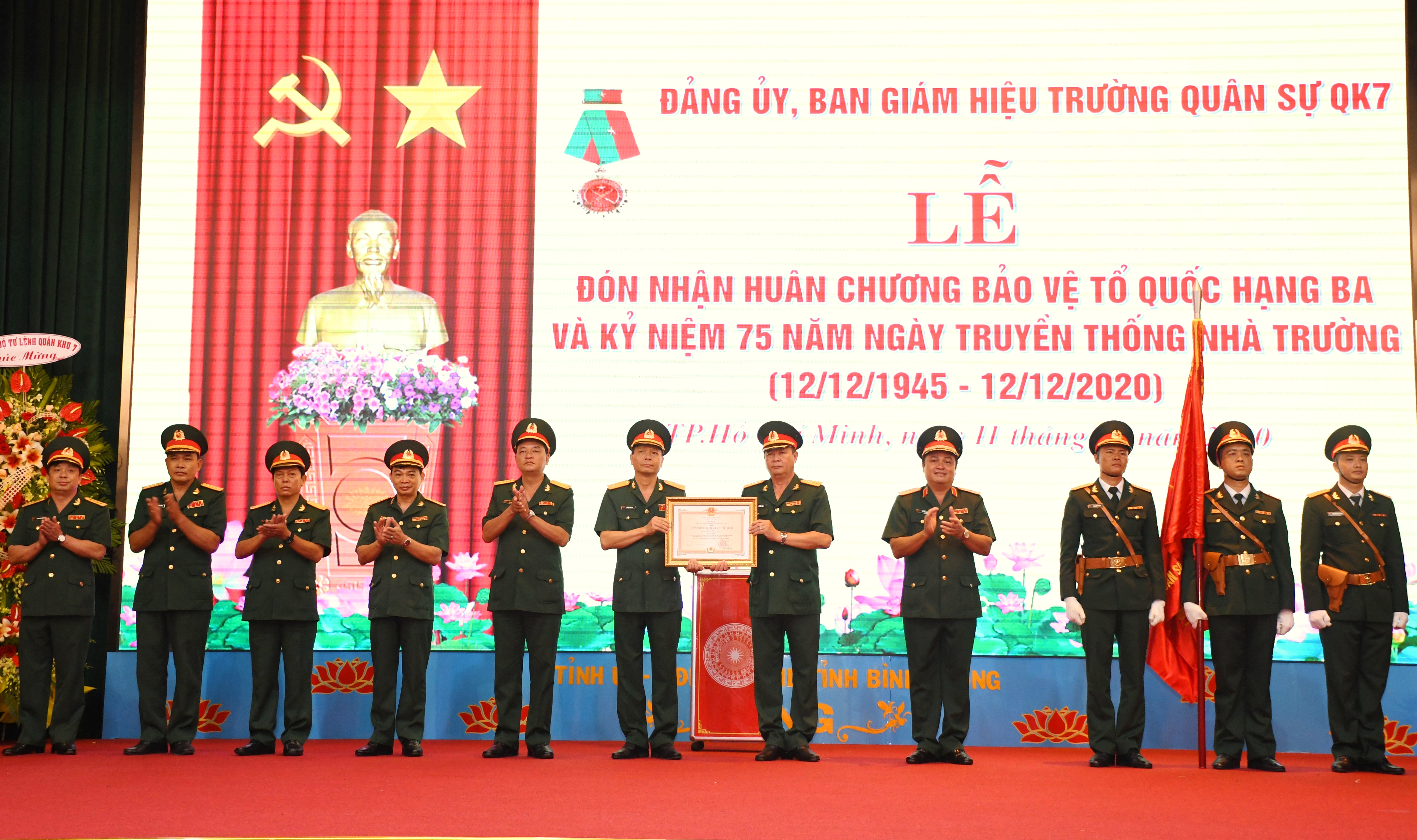 Tại buổi lễ, thừa ủy quyền của Chủ tịch nước, Thiếu tướng Đỗ Văn Bảnh, Phó Chính ủy Quân khu 7 trao Huân chương Bảo vệ Tổ quốc hạng Ba cho Trường Quân sự Quân khu.
