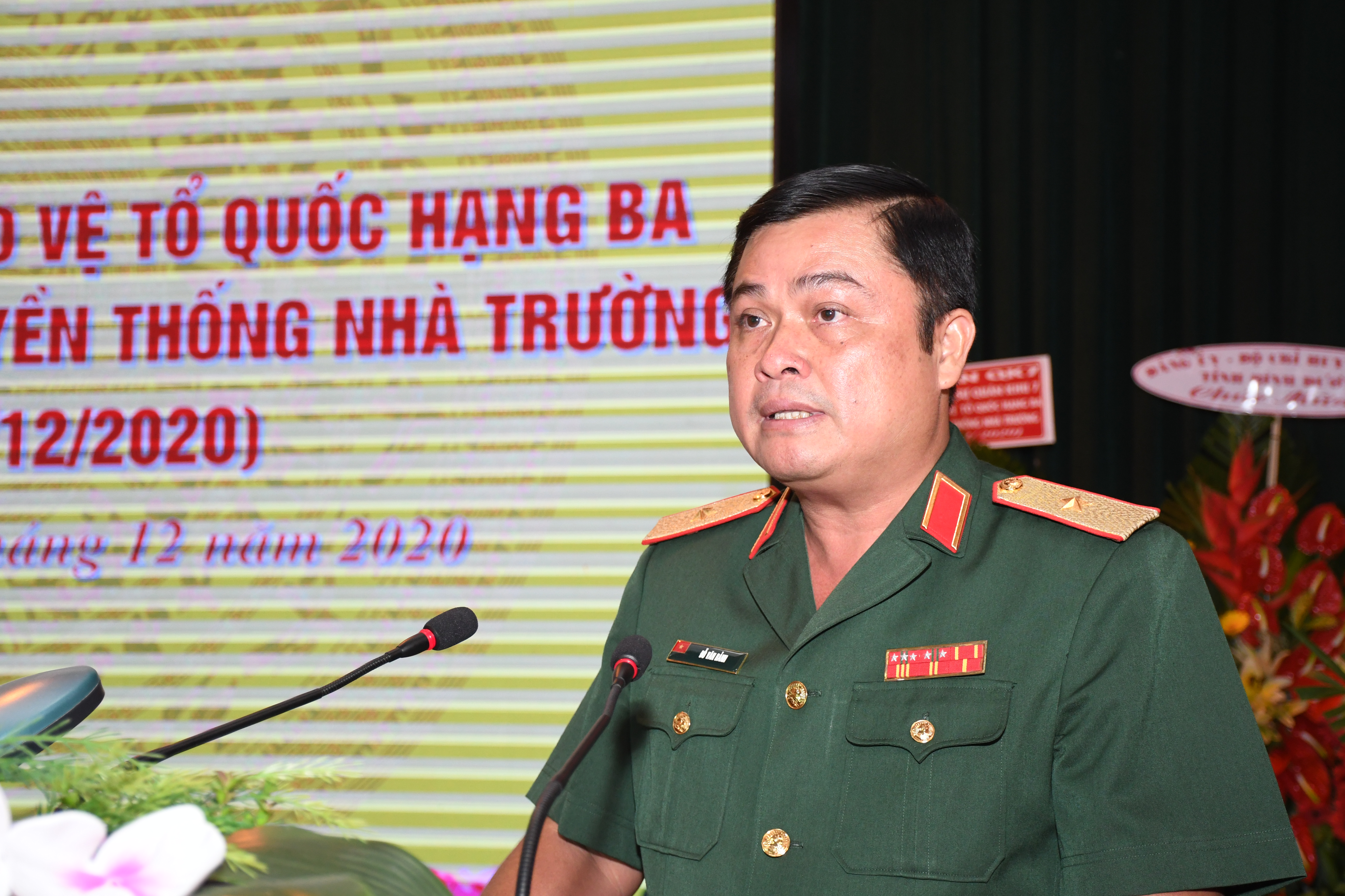 Thiếu tướng Đỗ Văn Bảnh, Phó Chính ủy Quân khu 7 trao Huân chương Bảo vệ Tổ quốc hạng Ba cho nhà trường.
