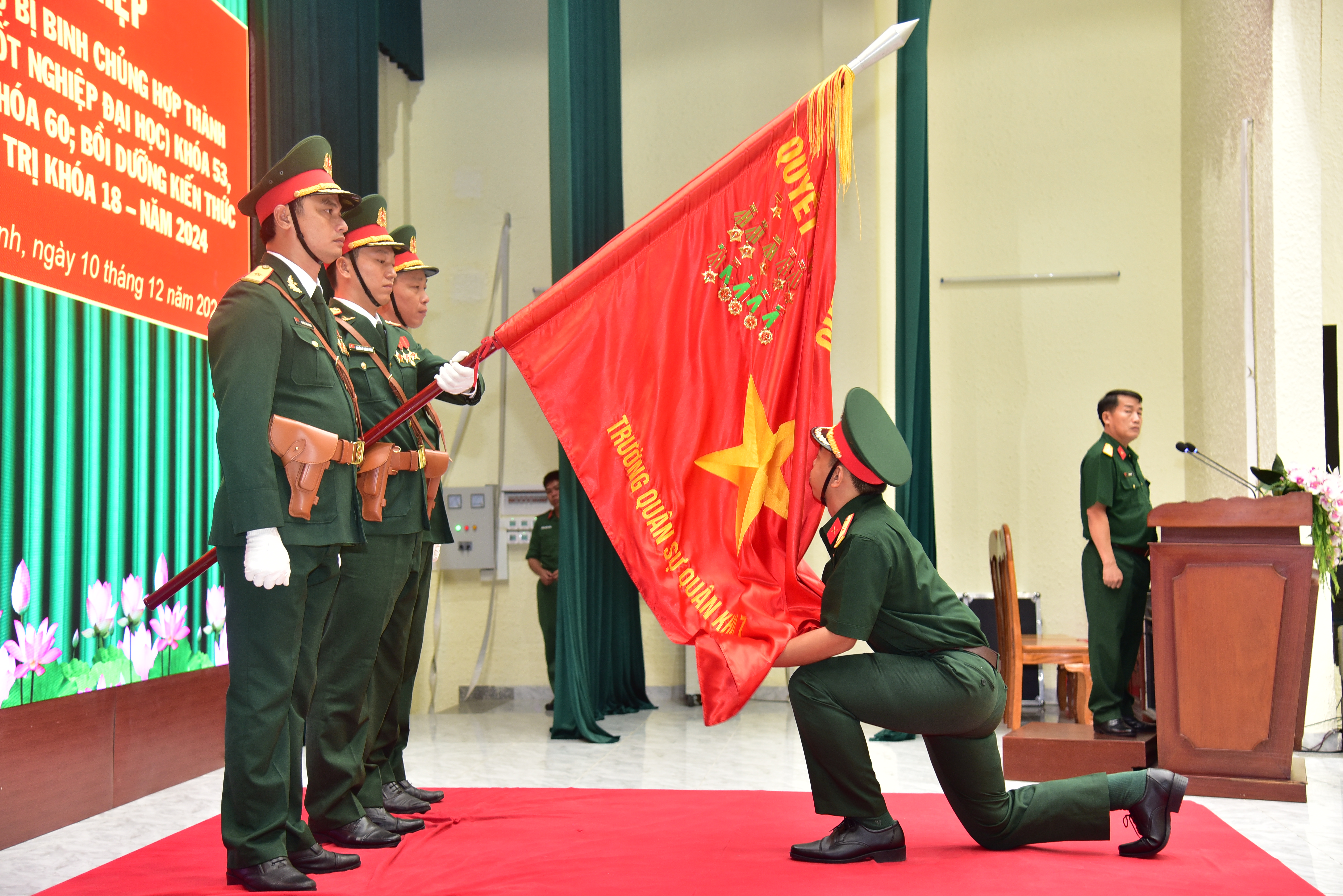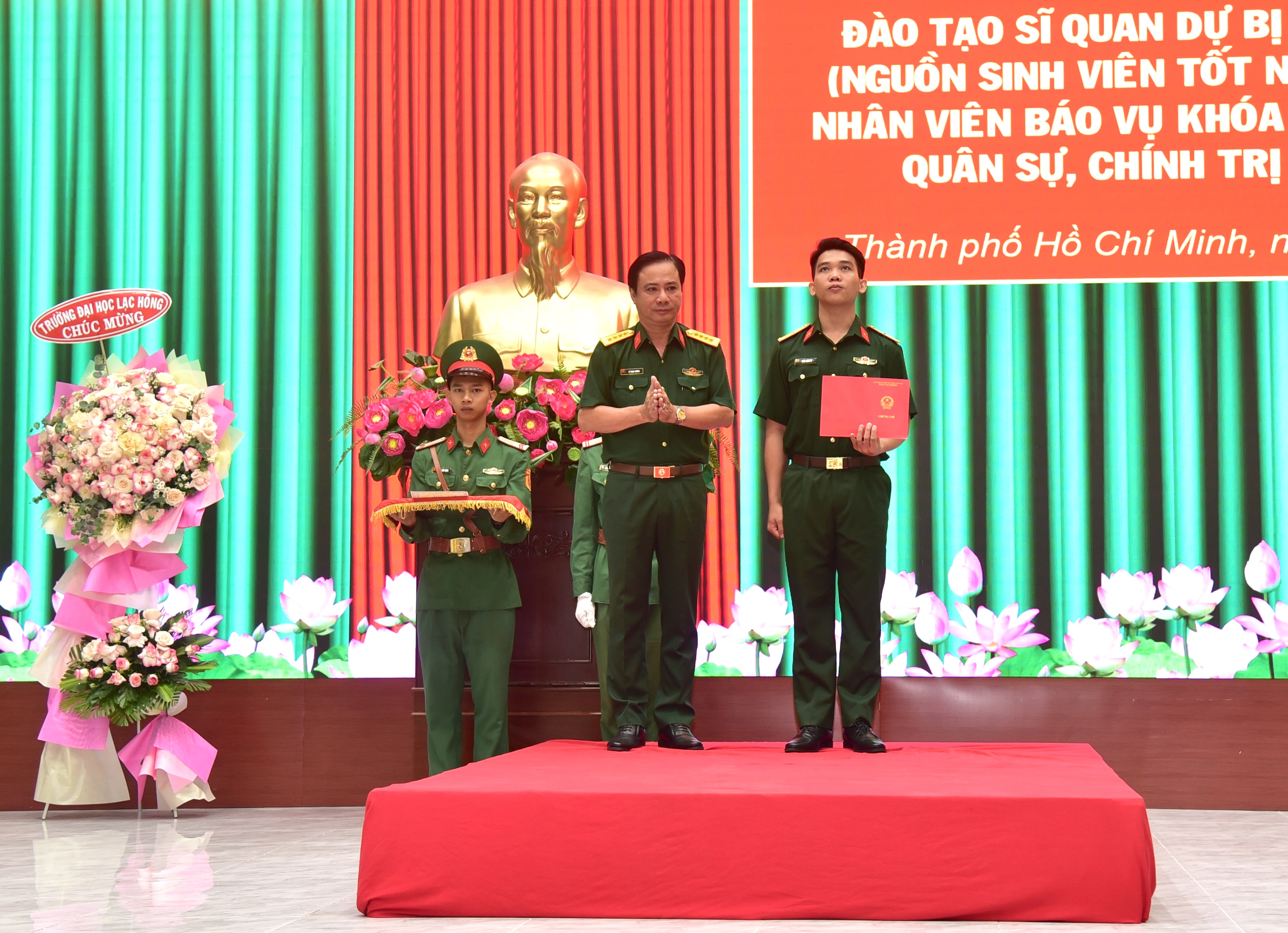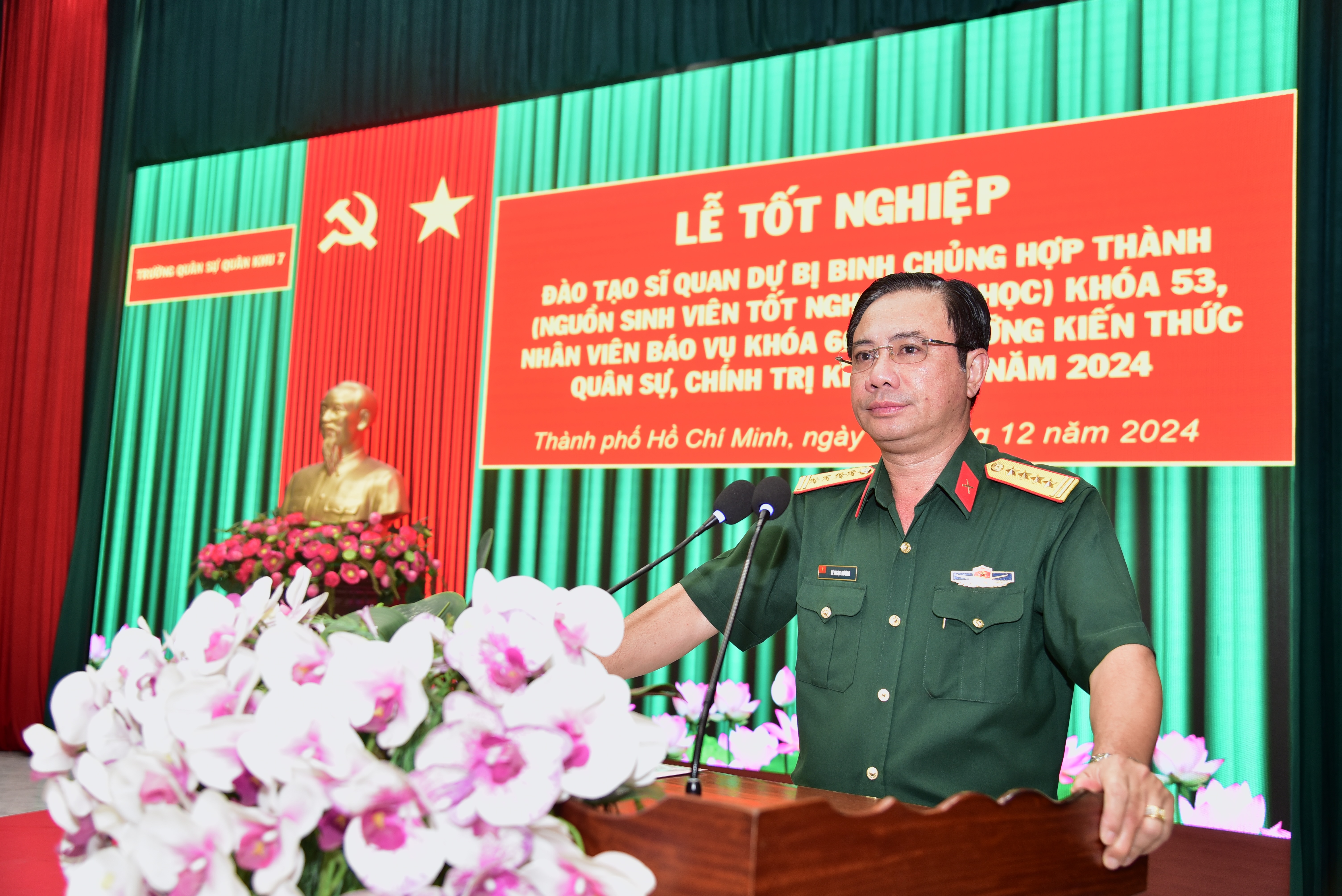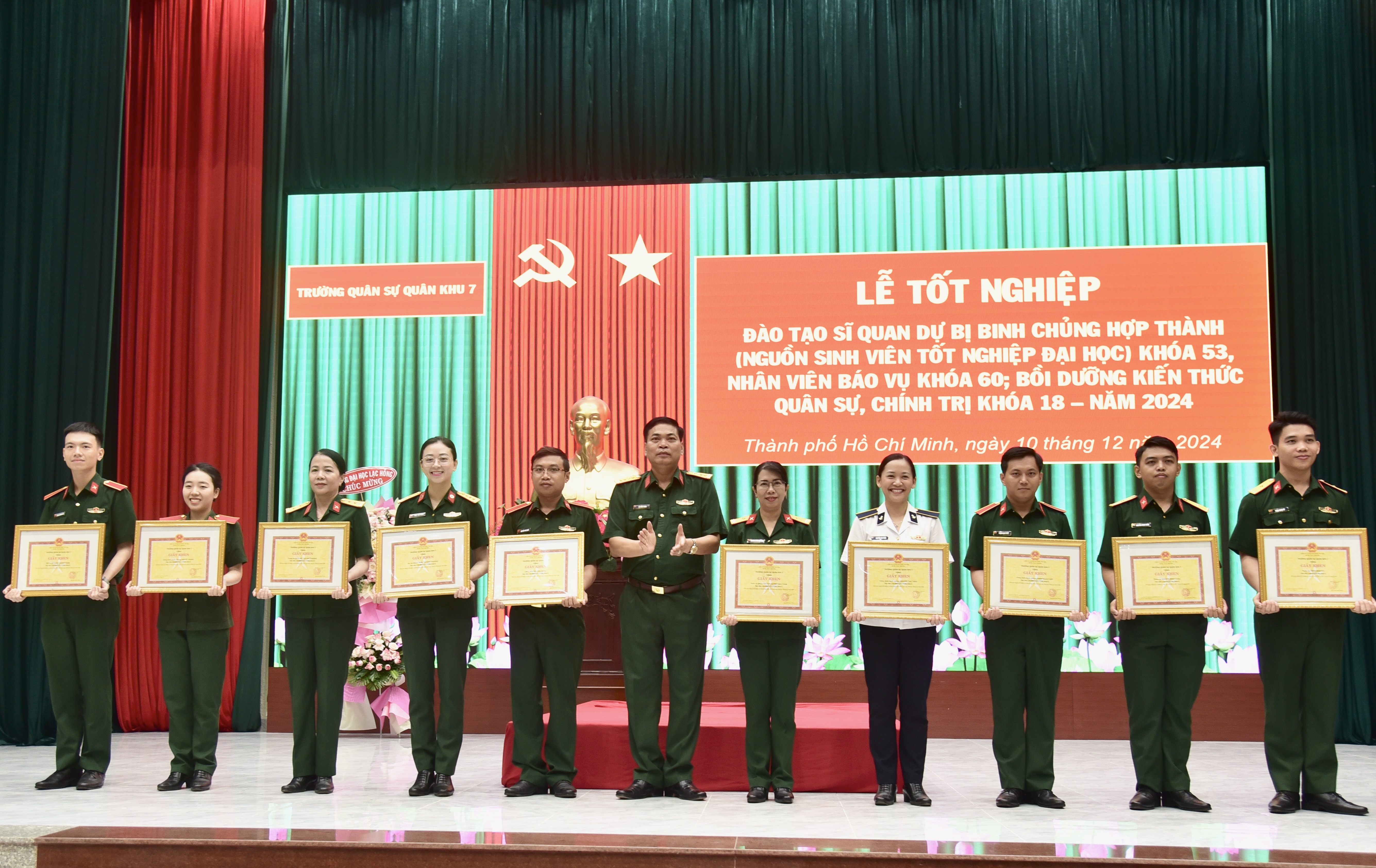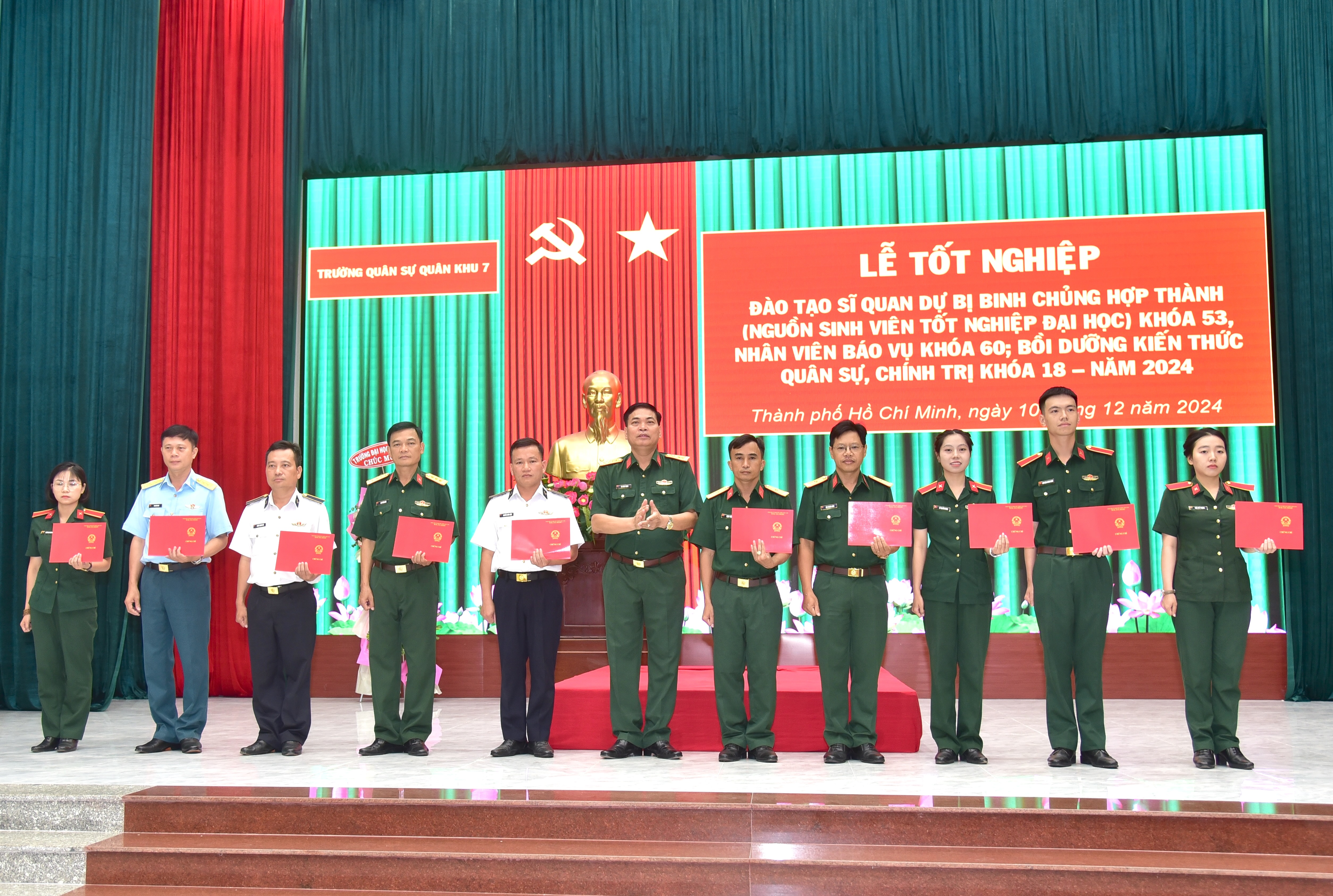 Đại tá Bùi Đình Thành, Bí thư Đảng ủy, Chính ủy Trường Quân sự Quân khu 7 trao Chứng chỉ tốt nghiệp.