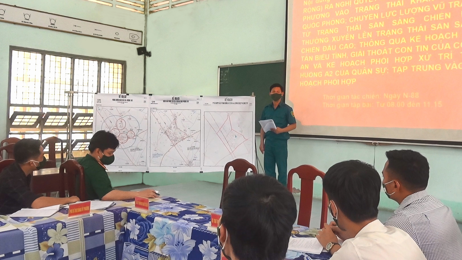 Các học viên tham gia nội dung diễn tập gồm 3 giai đoạn: chuyển cấp xã vào các trạng thái quốc phòng an ninh; chuyển lực lượng vũ trang vào các trạng thái sẵn sàng chiến đấu; tổ chức chuẩn bị chiến đấu phòng thủ và thực hành chiến đấu phòng thủ.