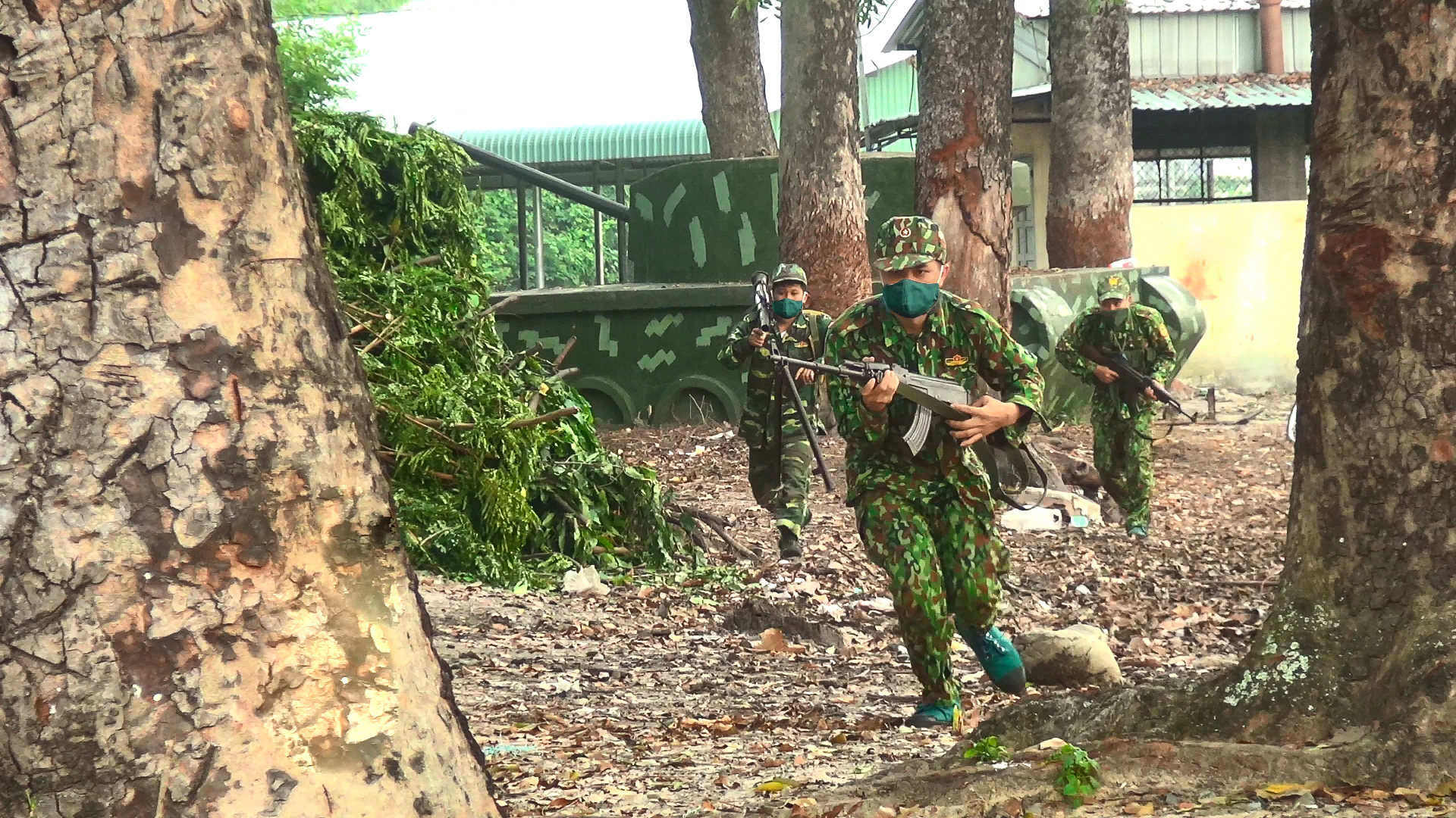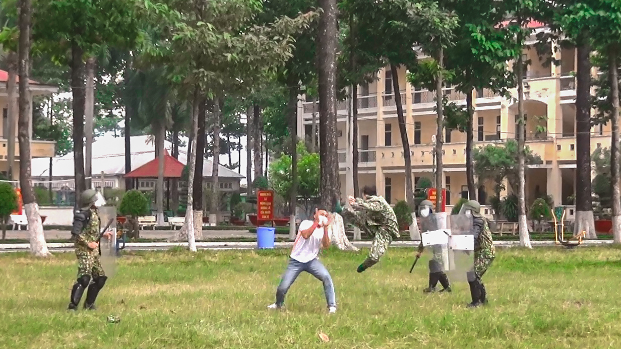 Thực hành diễn tập trung đội dân quân cơ động bảo vệ mục tiêu trong phòng chống bạo loạn.