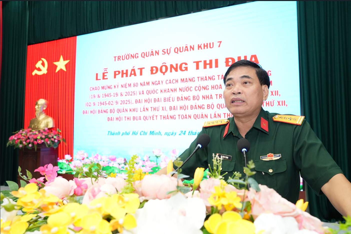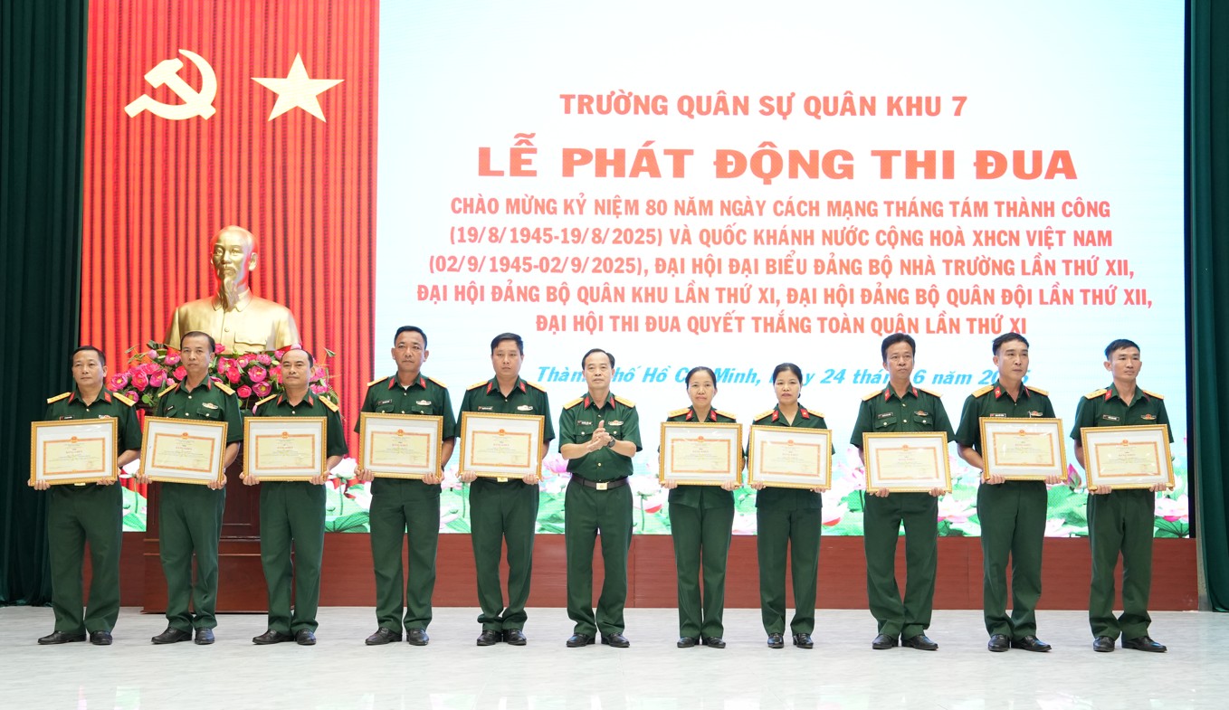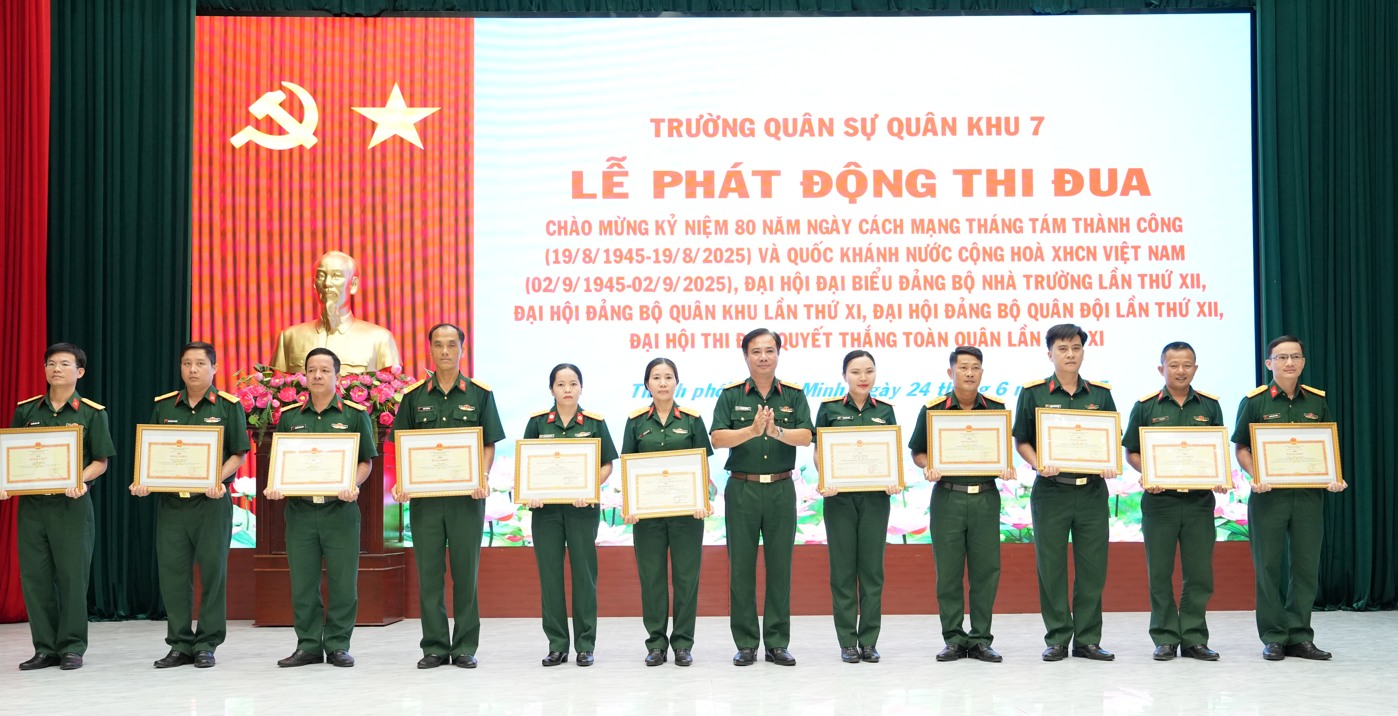 (QK7 Online) - Ngày 24/6, Trường Quân sự Quân khu 7 tổ chức lễ phát động đợt thi đua cao điểm với chủ đề: “Phất cao cờ hồng tháng Tám - Thi đua giành 3 nhất” thiết thực lập thành tích chào mừng kỷ niệm 80 năm Cách mạng Tháng Tám thành công (19/8/1945-19/8/2025) và Quốc khánh nước Cộng hòa XHCN Việt Nam (2/9/1945-2/9/2025); chào mừng Đại hội đại biểu Đảng bộ Quân khu lần thứ XI, Đại hội Thi đua Quyết thắng toàn quân lần thứ XI, Đại hội đại biểu Đảng bộ Quân đội lần thứ XII. Đại tá Bùi Đình Thành, Bí thư Đảng ủy, Chính ủy nhà trường chủ trì Lễ phát động thi đua.