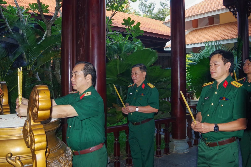 Thủ trưởng Trường Sĩ quan Lục quân 2 và Thủ trưởng Sư đoàn 5 dâng hương, dâng hoa tưởng niệm Chủ tịch Hồ Chí Minh và các Anh hùng liệt sĩ.