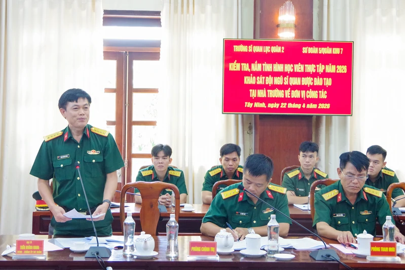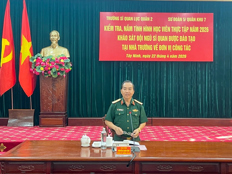 (QK7 Online) – Ngày 22/4, đoàn công tác của Trường Sĩ quan Lục quân 2 do Trung tướng Nguyễn Xuân Sơn, Bí thư Đảng ủy, Chính ủy Nhà trường làm trưởng đoàn đã đến khảo sát, nắm tình hình học viên thực tập năm 2026 và đội ngũ sĩ quan được đào tạo tại Nhà trường về công tác tại Sư đoàn 5. Tiếp và làm việc với đoàn công tác có Đại tá Trần Hoàng Giang, Bí thư Đảng ủy, Chính ủy Sư đoàn 5 cùng Thủ trưởng các cơ quan, đơn vị.
