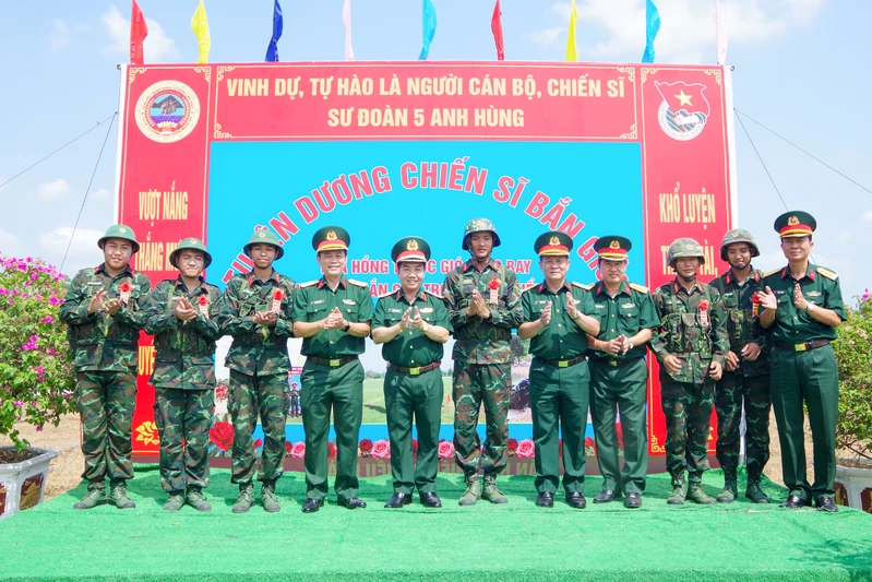 Trung tướng Nguyễn Xuân Sơn, Bí thư Đảng ủy, Chính ủy Trường Sĩ quan Lục quân 2 và Đại tá Trần Hoàng Giang, Bí thư Đảng ủy, Chính ủy Sư đoàn 5 tặng “hoa bắn giỏi” cho chiến sĩ mới đạt thành tích cao