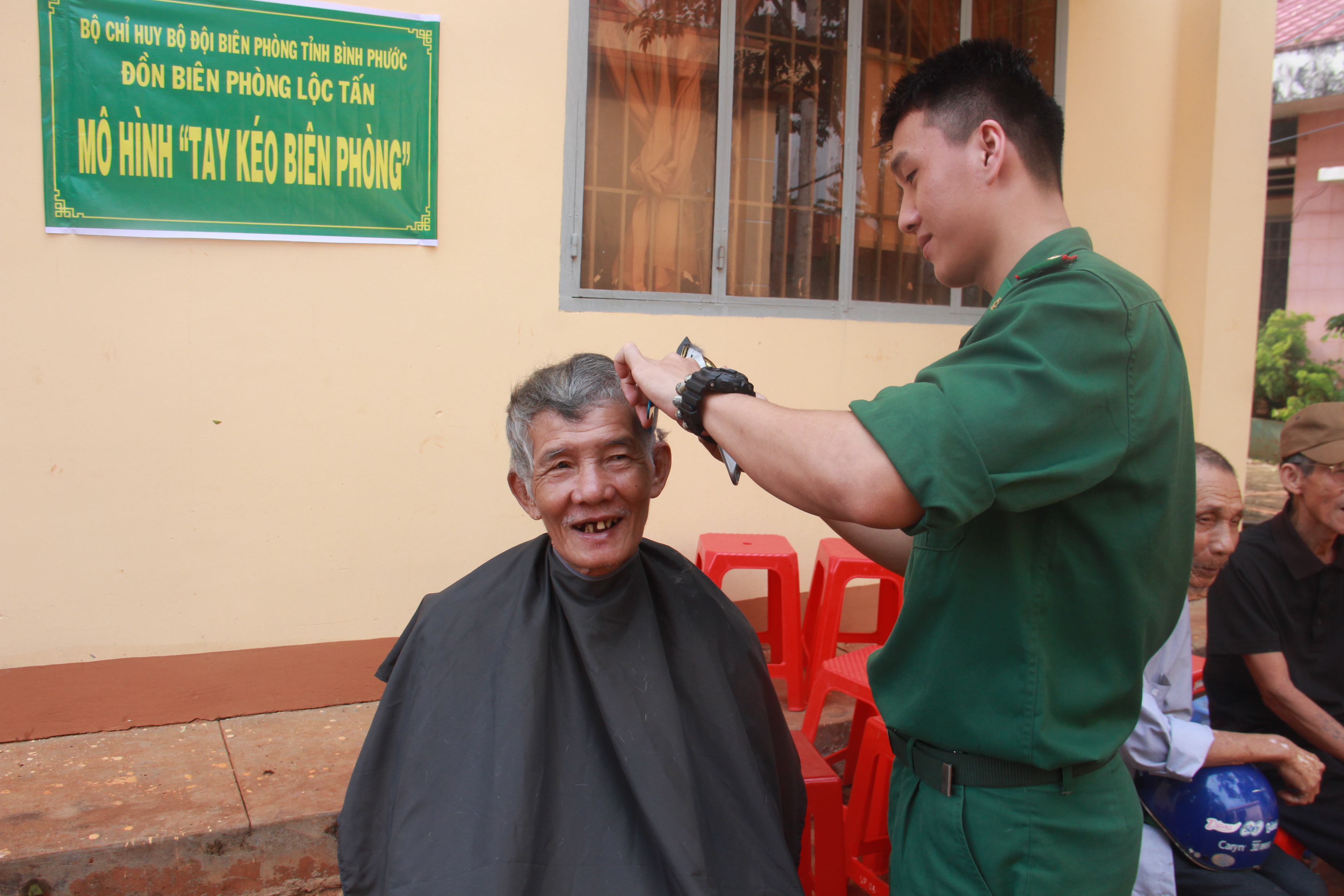 Các “tay kéo Biên phòng” tình nguyện cắt tóc cho người dân tại Chương trình “Chia sẻ yêu thương - Nghĩa tình biên giới”.