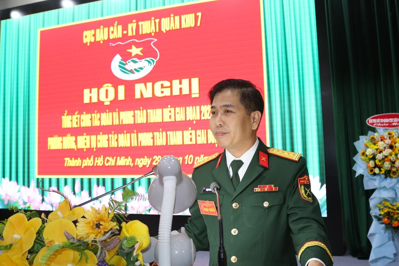 (QK7 Online) - Sáng 29/10, Cục Hậu cần - Kỹ thuật Quân khu tổ chức hội nghị tổng kết công tác Đoàn và phong trào Thanh niên giai đoạn 2022 - 2025; đề ra phương hướng, nhiệm vụ công tác giai đoạn 2025 - 2030. Đại tá Trần Văn Long, Phó Chính ủy Cục Hậu cần - Kỹ thuật Quân khu dự và phát biểu chỉ đạo hội nghị.