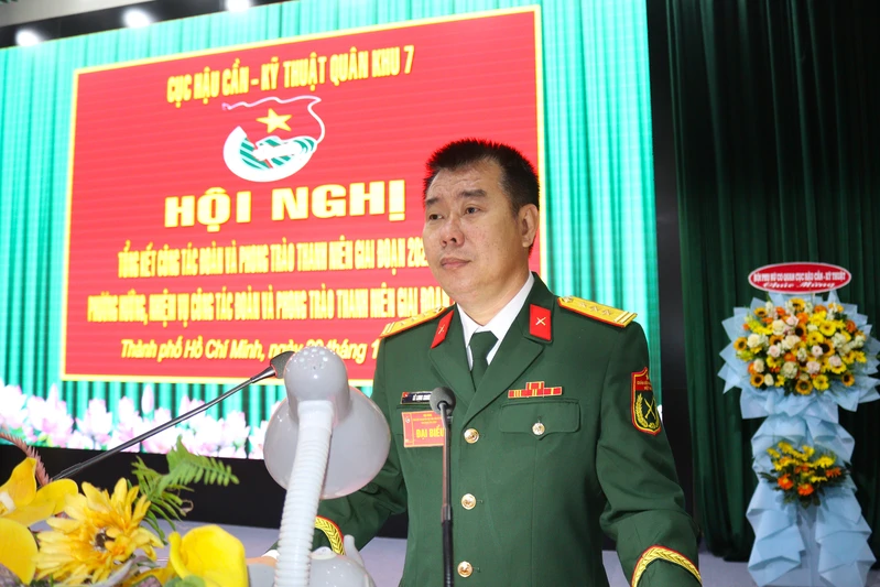 Thượng tá Lê Long Khương, Phó Chủ nhiệm Chính trị Cục Hậu cần - Kỹ thuật Quân khu báo cáo tổng kết công tác Đoàn và phong trào Thanh niên giai đoạn 2022 - 2025.