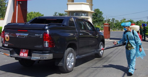 Tiểu đoàn 24 Quân y phun thuốc khử trùng xe ra vào cổng.