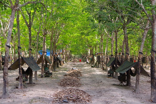 Tại Trung đoàn 5, chúng tôi có dịp luyện tập nội dung hành trú quân cùng cán bộ, chiến sĩ Tiểu đoàn 4, để phục vụ nhiệm vụ diễn tập chiến thuật vòng tổng hợp. Chiều buông xuống, bất chợt trời đổ mưa, rừng cao su ẩm ướt, song vừa đến nơi dừng chân, ai cũng nêu cao ý thức địch tình, tuyệt đối làm theo mệnh lệnh của người chỉ huy, nhanh chóng triển khai đội hình, mắc tăng võng, căng bạt, đào bếp Hoàng Cầm...mọi hành động của các chiến sĩ trẻ diễn ra thoăn thoắt, khẩn trương với tinh thần lạc quan, bản lĩnh. Ở mỗi điểm tập nổi bật là băng rôn cùng dòng chữ “Thi đua huấn luyện giỏi, kỷ luật nghiêm, chào mừng kỷ niệm 75 năm Cách mạng Tháng Tám và Quốc khánh 02/9”, càng làm tăng thêm khí thế nhiệt huyết, hăng say của các chiến sĩ trẻ, quyết tâm khắc phục khó khăn, vươn lên hoàn thành xuất sắc nhiệm vụ.