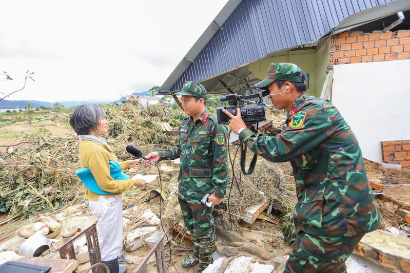 Êkíp Biên tập viên, phóng viên Báo Quân khu tác nghiệp tại xã D’Ran, tỉnh Lâm Đồng, một trong những địa phương chịu ảnh hưởng nặng nề của đợt lũ lụt.