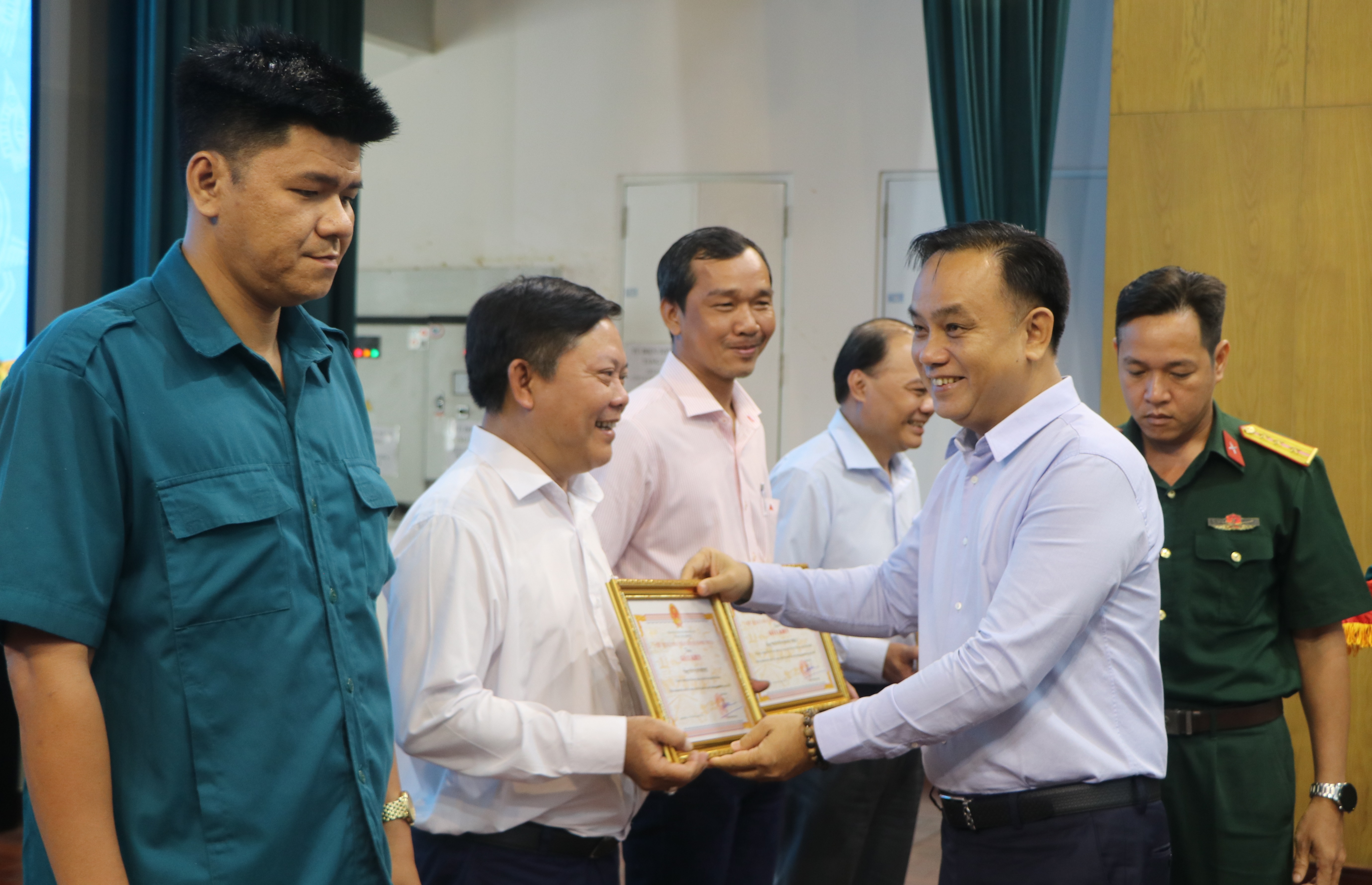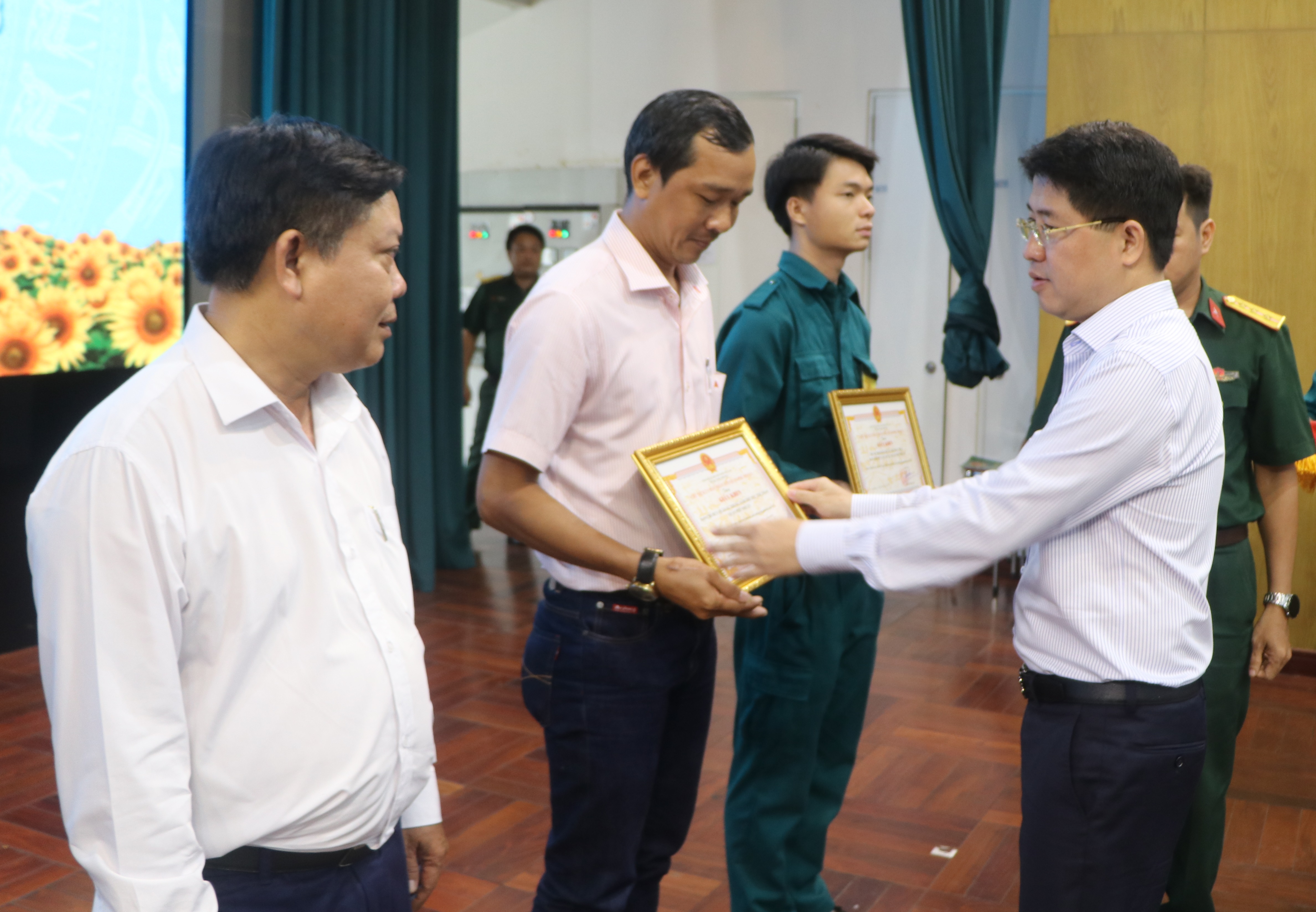 Đồng chí Nguyễn Đông Tùng, Chủ tịch UBND quận trao thưởng cho các cá nhân có thành tích trong công tác quân sự, quốc phòng địa phương năm 2022.