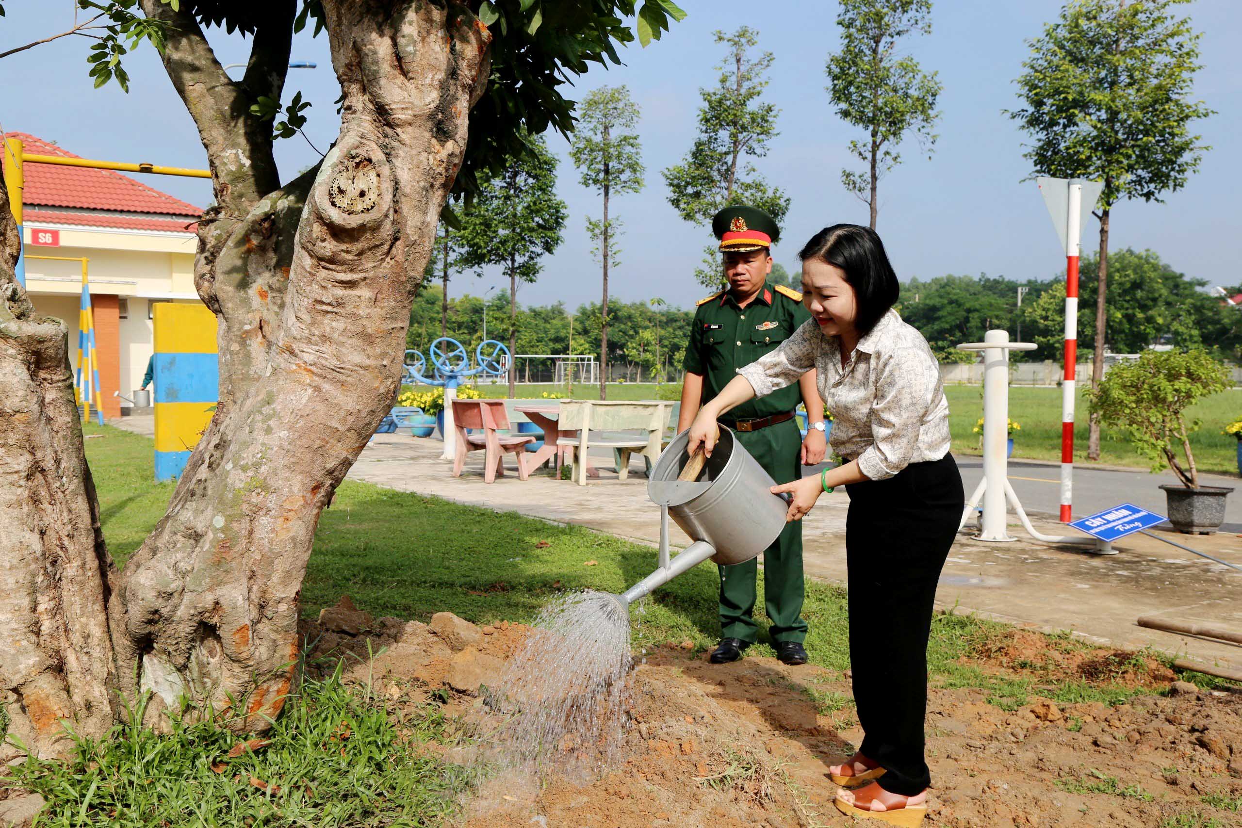 Đồng chí Nguyễn Thu Cúc, Chủ tịch UBND thành phố trồng cây tại Ban CHQS thành phố Thủ Dầu Một.