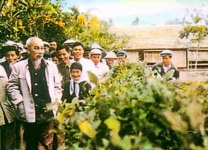 Làng đẹp như một bức tranh thủy mặc yên bình, ngay từ trên đường dẫn vào ngôi nhà của Bác, có hàng tre vút cao rì rào trong gió, có hàng hoa râm bụt rực đỏ đung đưa nhè nhẹ, có hương sen, hương cau, thoang thoảng quyện với hương bưởi thơm dịu làm xao xuyến lòng người.