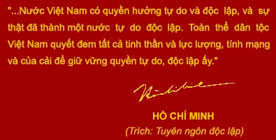 Tuyên ngôn Độc lập trịnh trọng tuyên bố:“Nước Việt Nam có quyền hưởng tự do và độc lập, và thật sự đã trở thành một nước tự do, độc lập”.