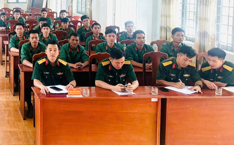 Đại diện Ban chỉ huy phòng thủ khu vực 4 - Bình Long và cán bộ, chiến sĩ Đại đội 3 dự buổi tuyên truyền, phổ biến giáo dục pháp luật.