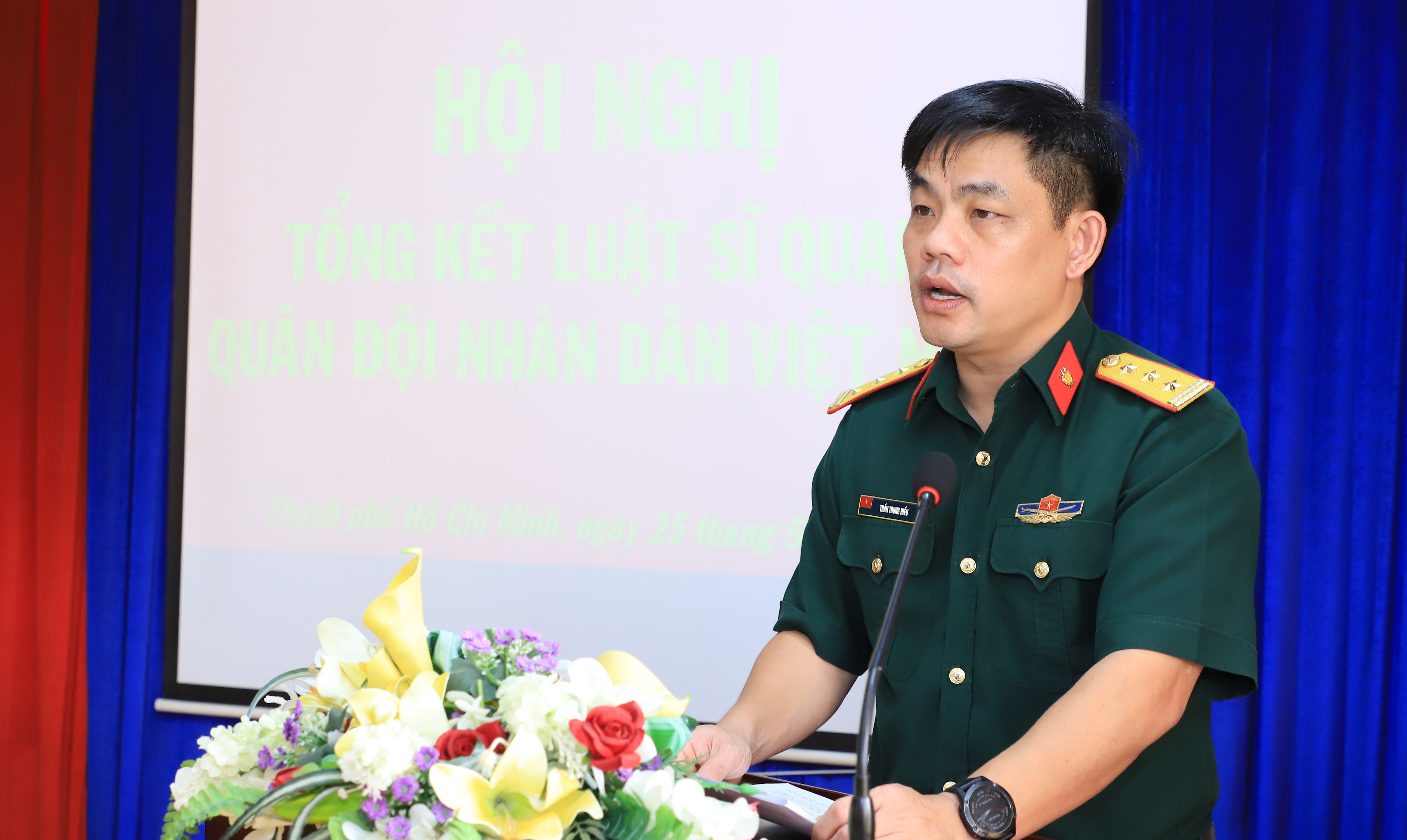 Thượng tá Trần Trung Hiếu, Phó Viện trưởng Viện KSQS QK7 trình bày dự thảo báo cáo Tổng kết Luật Sĩ quan QĐNDVN.