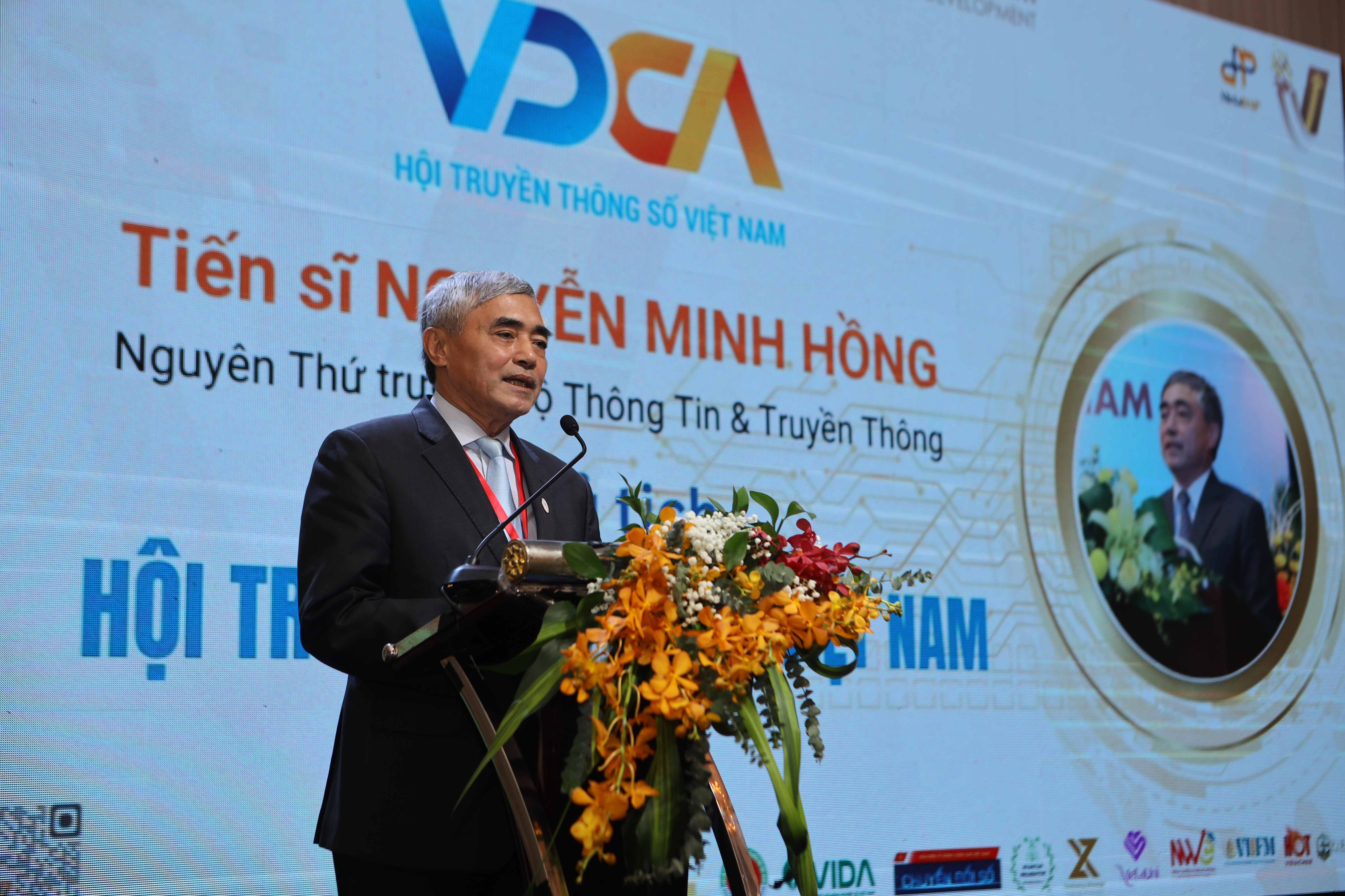 Tiến sĩ Nguyễn Minh Hồng, Nguyên Thứ trưởng Bộ Thông tin và Truyền thông, Chủ tịch Hội Truyền thông số Việt Nam phát biểu chúc mừng.