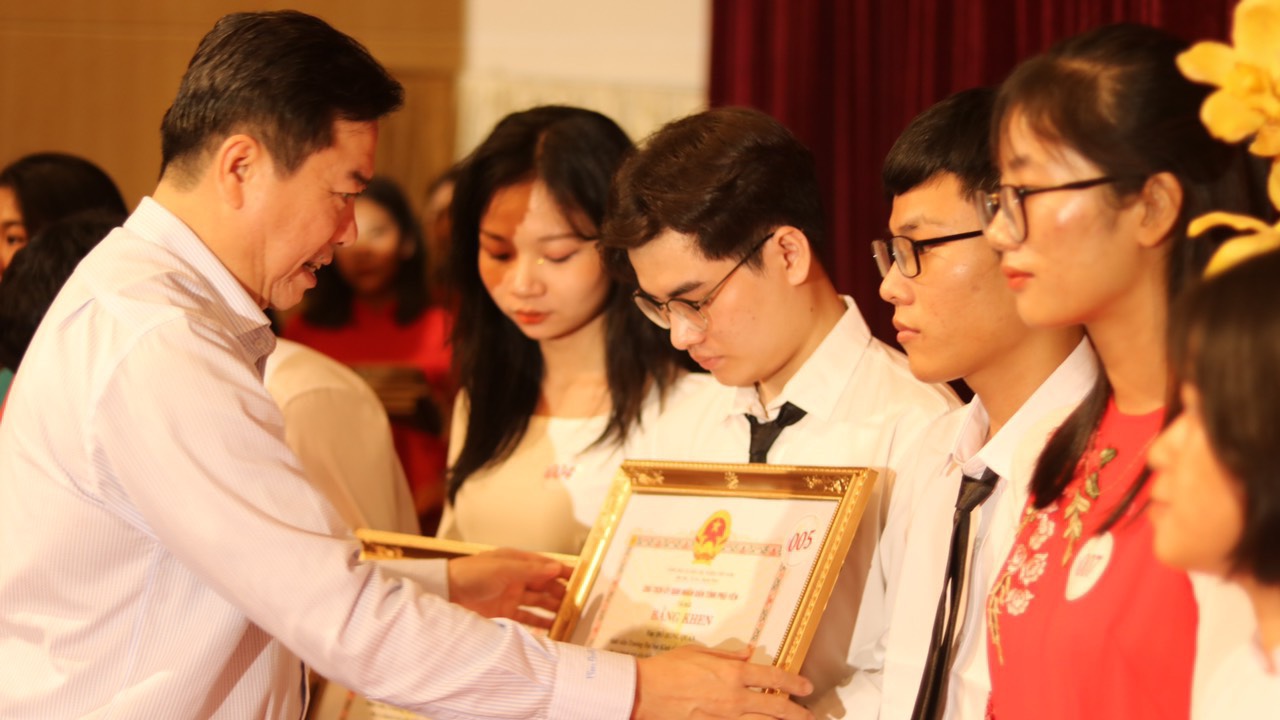 Đồng chí Trần Hữu Thế, Chủ tịch UBND tỉnh trao bằng khen của UBND tỉnh cho các sinh viên tiêu biểu.