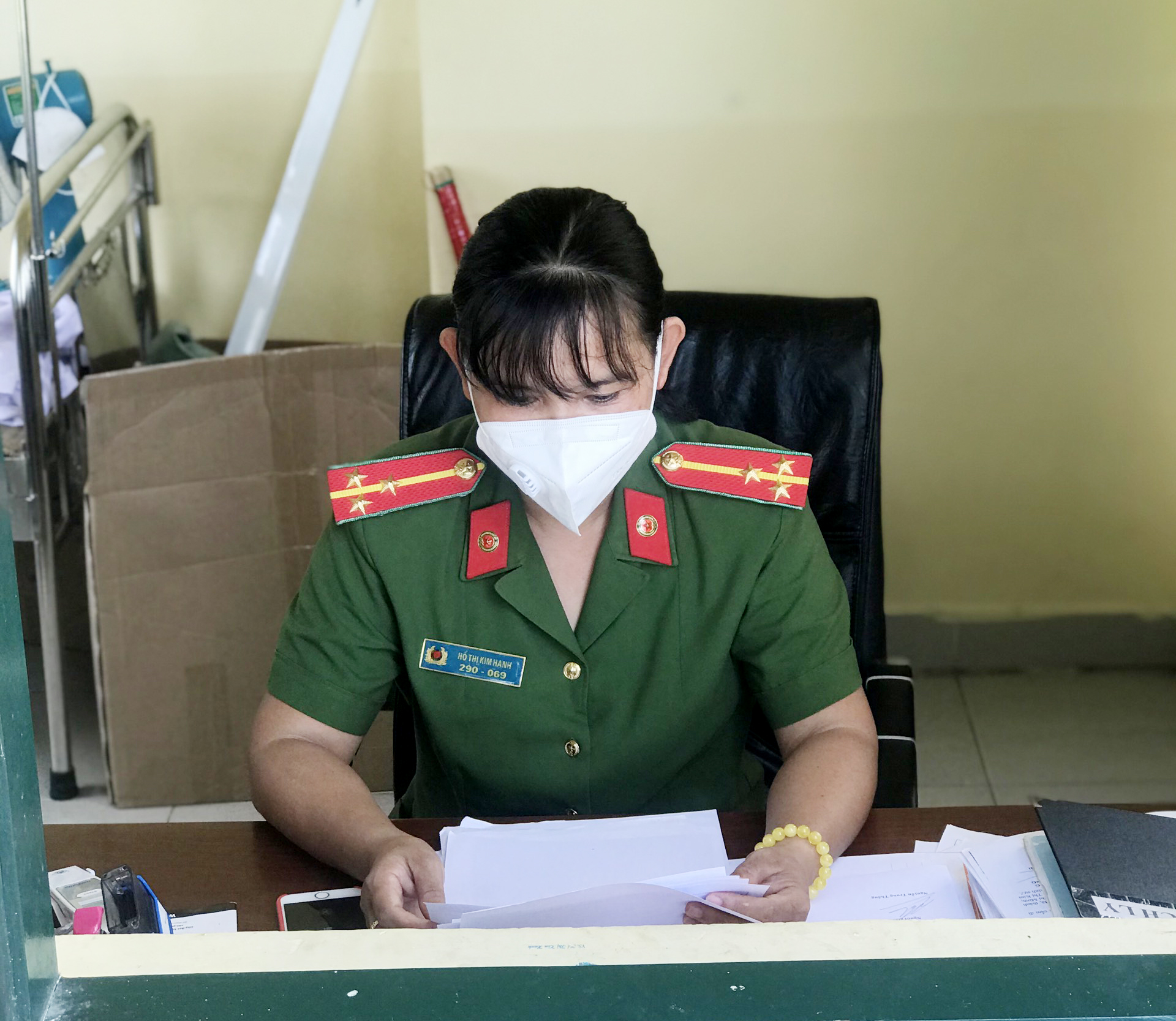 Còn Thượng úy Hồ Thị Kim Hanh phải tham gia tuyến đầu truy vết, ngăn chặn không cho dịch lây lan trong đơn vị. Vì vậy, chị và đồng nghiệp phải sàn lọc xác minh từng đối tượng, gặp trực tiếp từng người nghi ngờ là F0, F1 để đưa những người này vào khu điều trị, khu cách ly y tế tập trung tại đơn vị. Có hôm đi đến 2 – 3 giờ sáng vẫn còn làm việc, lúc này con đã ngon giấc cùng ông bà nội không gọi về căn dặn được gì, vừa ngủ được khoảng 3-4 tiếng lại tiếp tục công việc của mình. Hết ngày này đến ngày khác như vậy nhưng chị luôn cố gắng hoàn thành nhiệm vụ được giao để cùng chung sức chiến thắng dịch Covid-19.