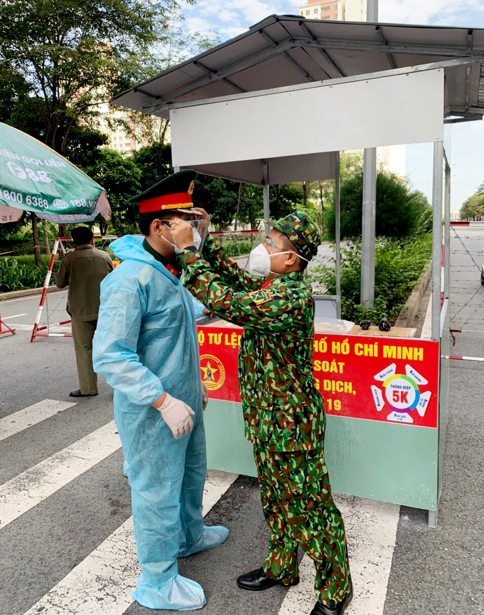 Thiếu tá Nguyễn Quốc Trầm (bên phải) hỗ trợ đồng đội mang bảo hộ phòng, chống dịch Covid-19.