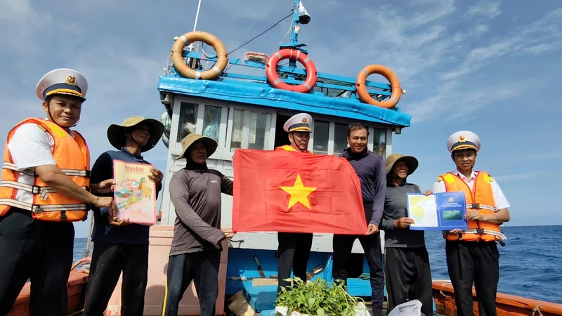 Lực lượng của Vùng 2 tuyên truyền, tặng cờ Tổ quốc cho ngư dân trên biển.