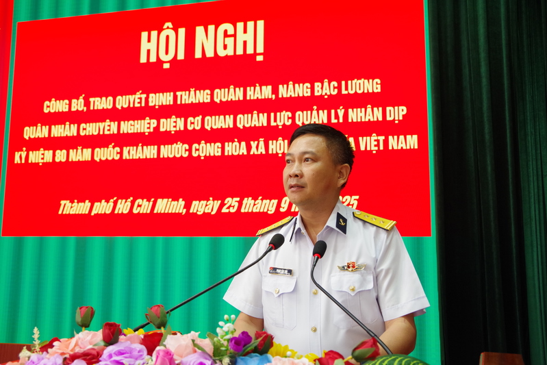 (QK7 Online) - Chiều 25/9, tại xã Long Sơn, TPHCM, Bộ Tư lệnh Vùng 2 Hải quân tổ chức hội nghị công bố, trao quyết định nâng bậc lương, thăng quân hàm cho quân nhân chuyên nghiệp (QNCN) diện cơ quan quân lực quản lý nhân dịp kỷ niệm 80 năm Quốc khánh nước Cộng hòa xã hội chủ nghĩa Việt Nam (2-9-1945/2-9-2025). Thượng tá Phạm Văn Sơn, Phó Tư lệnh, Tham mưu trưởng Vùng chủ trì hội nghị