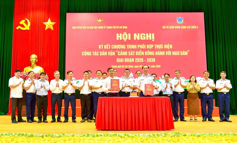 Bộ Tư lệnh Vùng Cảnh sát biển 3, Ban Tuyên giáo và Dân vận Thành ủy Thành phố Hồ Chí Minh ký kết chương trình phối hợp “Cảnh sát biển đồng hành với ngư dân” giai đoạn 2026 - 2030.