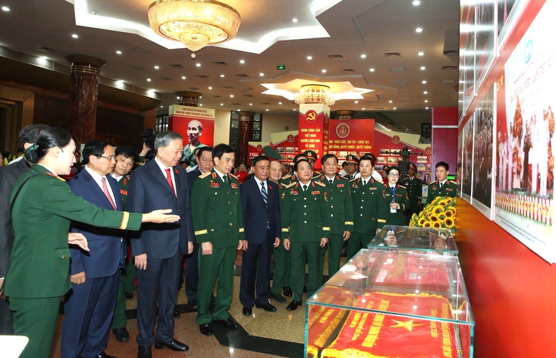 Tổng Bí thư Tô Lâm và các đại biểu dự Đại hội đại biểu Đảng bộ Quân đội lần thứ XII, nhiệm kỳ 2025 - 2030 tham quan triển lãm.
