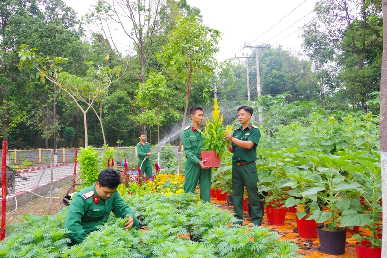Cán bộ, chiến sĩ Sư đoàn 7 trồng hoa, chỉnh trang đơn vị.