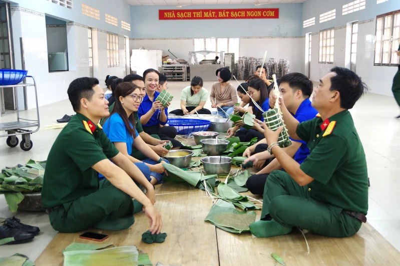 Ở khu nhà ăn Trung đoàn 165, không khí Tết càng trở nên ấm áp khi đơn vị tổ chức ngày hội gói bánh chưng. Cán bộ, chiến sĩ cùng các đoàn viên phường Phú Lợi, TP.HCM quây quần bên những mâm lá dong, gạo nếp, đậu xanh, thịt lợn. Những chiếc bánh chưng vuông vắn, chắc tay nhanh chóng được hoàn thiện cùng tiếng cười nói rộn rã thắt chặt tình cảm quân-dân.